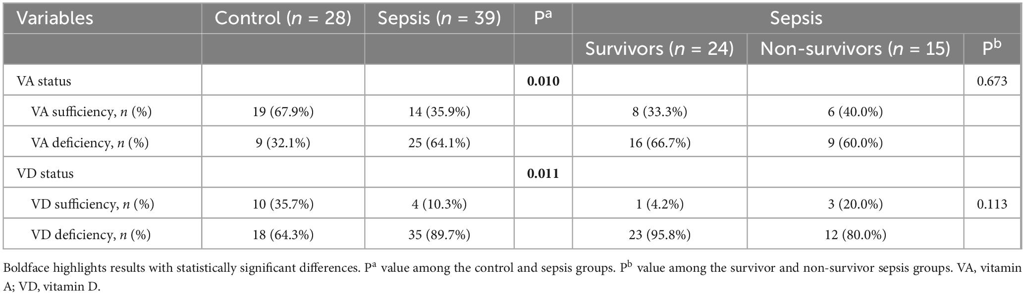 In accordance with the Chinese industry standards WS/T 677-2020 as well as WS/T 553-2017, VA deficiency was defined as a serum retinol concentration <200 ng/mL, with concentrations =200 ng/mL considered sufficient. Similarly, serum VD levels <20 ng/mL meant VD deficiency, with =20 ng/mL regarded as sufficient. In comparison to the control group, the data revealed a significantly higher prevalence of VA deficiency in the sepsis group (32.1% vs. 64.1%, P = 0.010). Likewise, the control group showed a lower prevalence of VD deficiency than the sepsis group (64.3% vs. 89.7%, P = 0.011). Furthermore, VA or VD deficiency did not differ between sepsis non-survivors and survivors (P > 0.05) (Table 2).