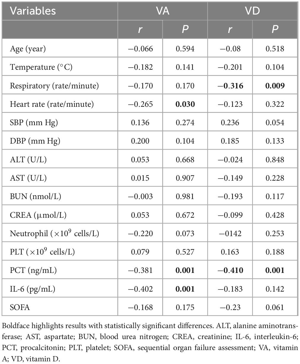 Correlation analysis explored the relationships among clinical parameters. As shown in Table 3, VA levels were negatively related to the heart rate, PCT and IL-6 (P < 0.05). However, VA was not related to age, temperature, respiratory rate, SBP, DBP, ALT, AST, BUN, CREA, neutrophil count, PLT, or SOFA scores (P > 0.05). VD levels were negatively related to the respiratory rate and PCT (P < 0.01), but did not to age, temperature, heart rate, SBP, DBP, AST, BUN, ALT, PLT, CREA, neutrophil count, or SOFA scores (P > 0.05).