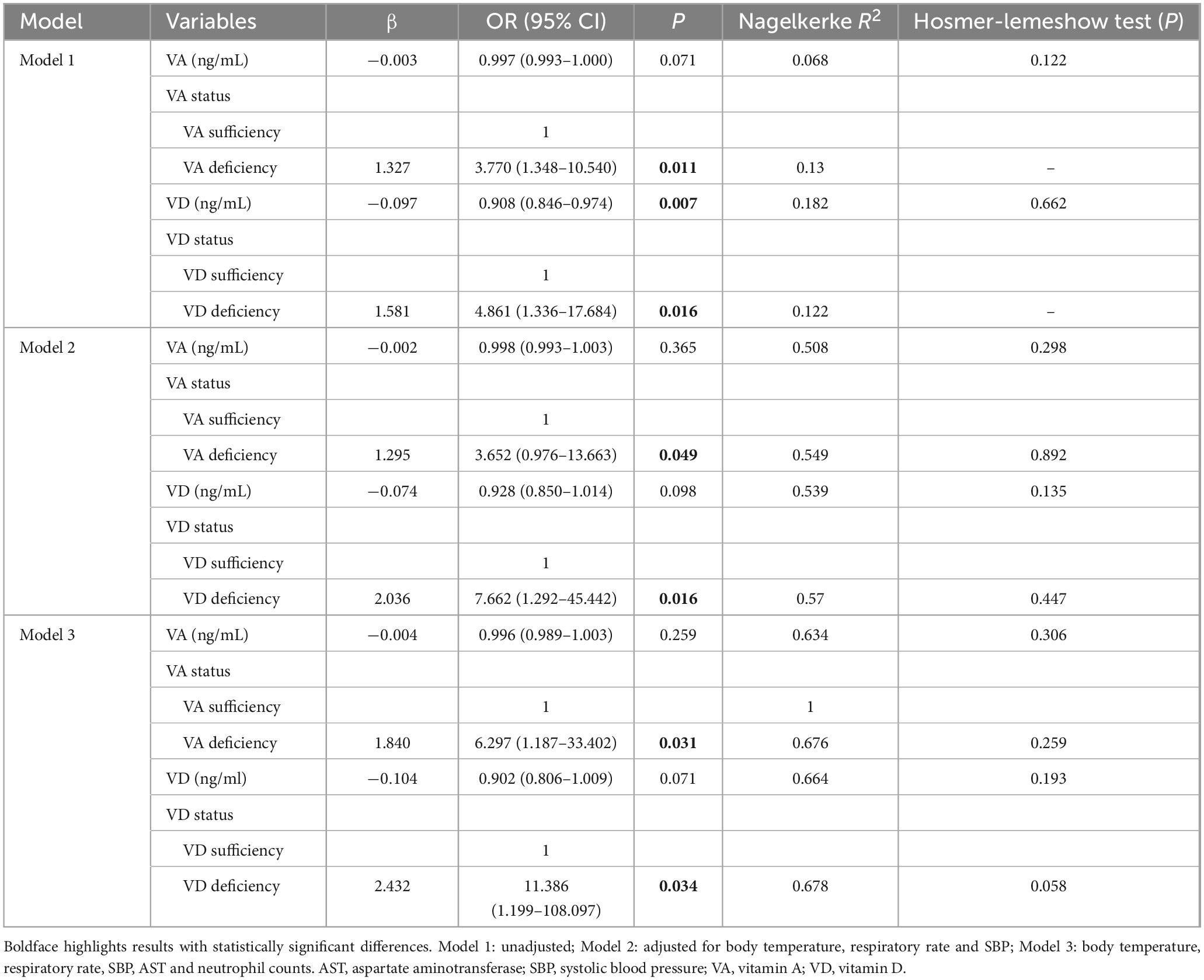 To examine whether VA and VD are independent factors associated with sepsis in older adults, multivariable binary logistic regression analysis was performed. The adjusted model contained variables (neutrophil count, body temperature, SBP, AST, and respiratory rate) that showed significant associations (P < 0.05) in univariate regression. As shown in Table 4, in the unadjusted analysis (Model 1), deficiencies of both VA and VD were associated with higher odds of sepsis. These associations remained significant after sequential adjustment for body temperature, respiratory rate, and SBP (Model 2), and further for AST and neutrophil counts (Model 3). In the fully adjusted model (Model 3), geriatric patients with VA deficiency were associated with 6.3-times higher odds (OR = 6.297, 95% CI = 1.187–33.402, P = 0.031), and those with vitamin D deficiency were associated with 11.4-times higher odds (OR = 11.386, 95% CI = 1.199–108.097, P = 0.034) of developing sepsis compared to individuals with adequate vitamin levels.