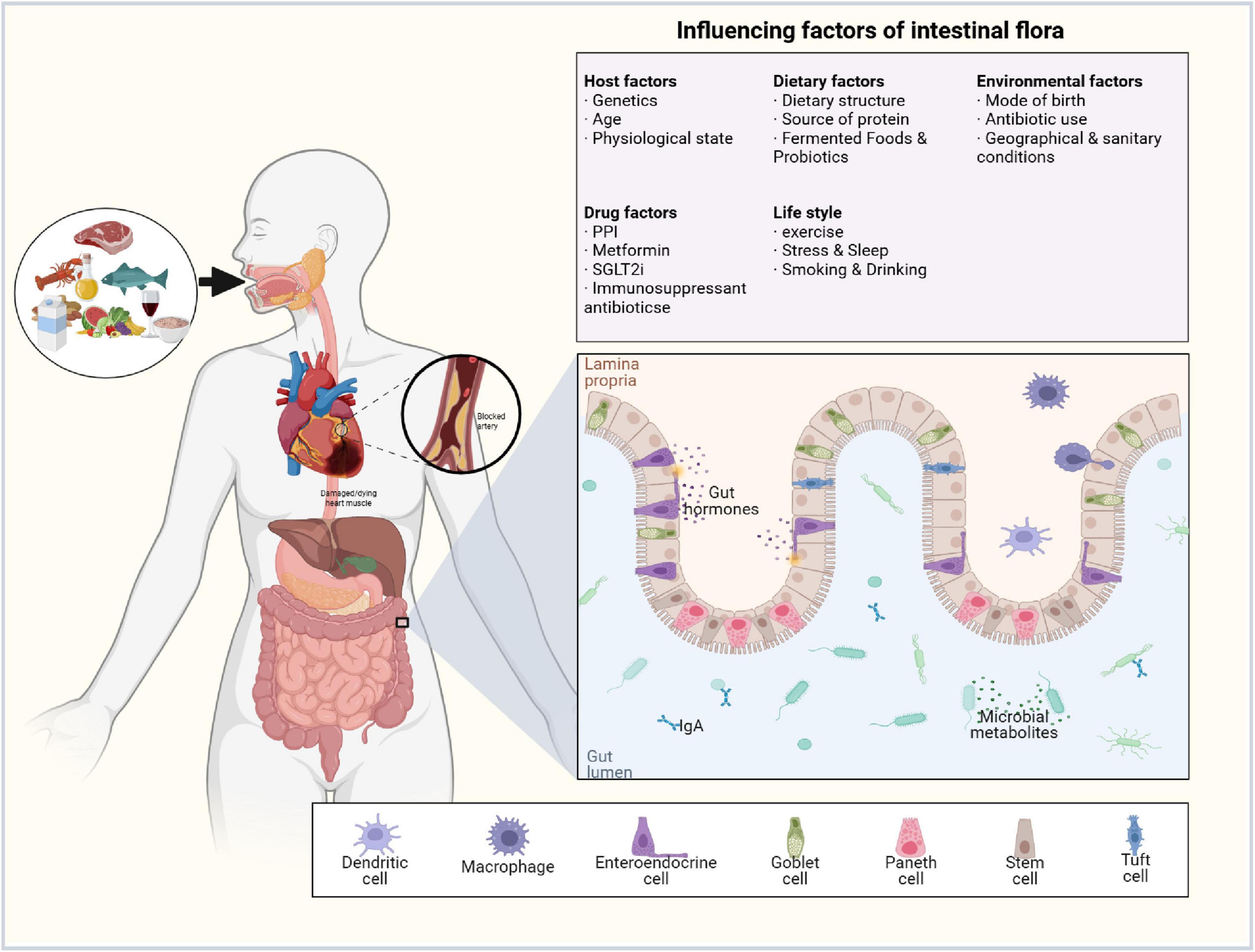 This figure illustrates the complex ecosystem of the gut microbiota and the multiple factors that influence its composition. The intestinal flora is shaped by a combination of host factors (such as genetics, age, and physiological state), dietary factors (including dietary structure, protein sources, and intake of fermented foods and probiotics), environmental factors (like mode of birth, antibiotic use, and geographical conditions), drug exposures (e.g., PPIs, metformin, SGLT2 inhibitors, and immunosuppressants), and lifestyle (such as exercise, stress, sleep, smoking, and drinking). The diagram also highlights key cellular components within the gut mucosa—including dendritic cells, macrophages, and various epithelial cells (e.g., goblet cells, Paneth cells, stem cells)—as well as microbial metabolites and gut hormones, which collectively participate in host-microbe interactions and maintain intestinal homeostasis.