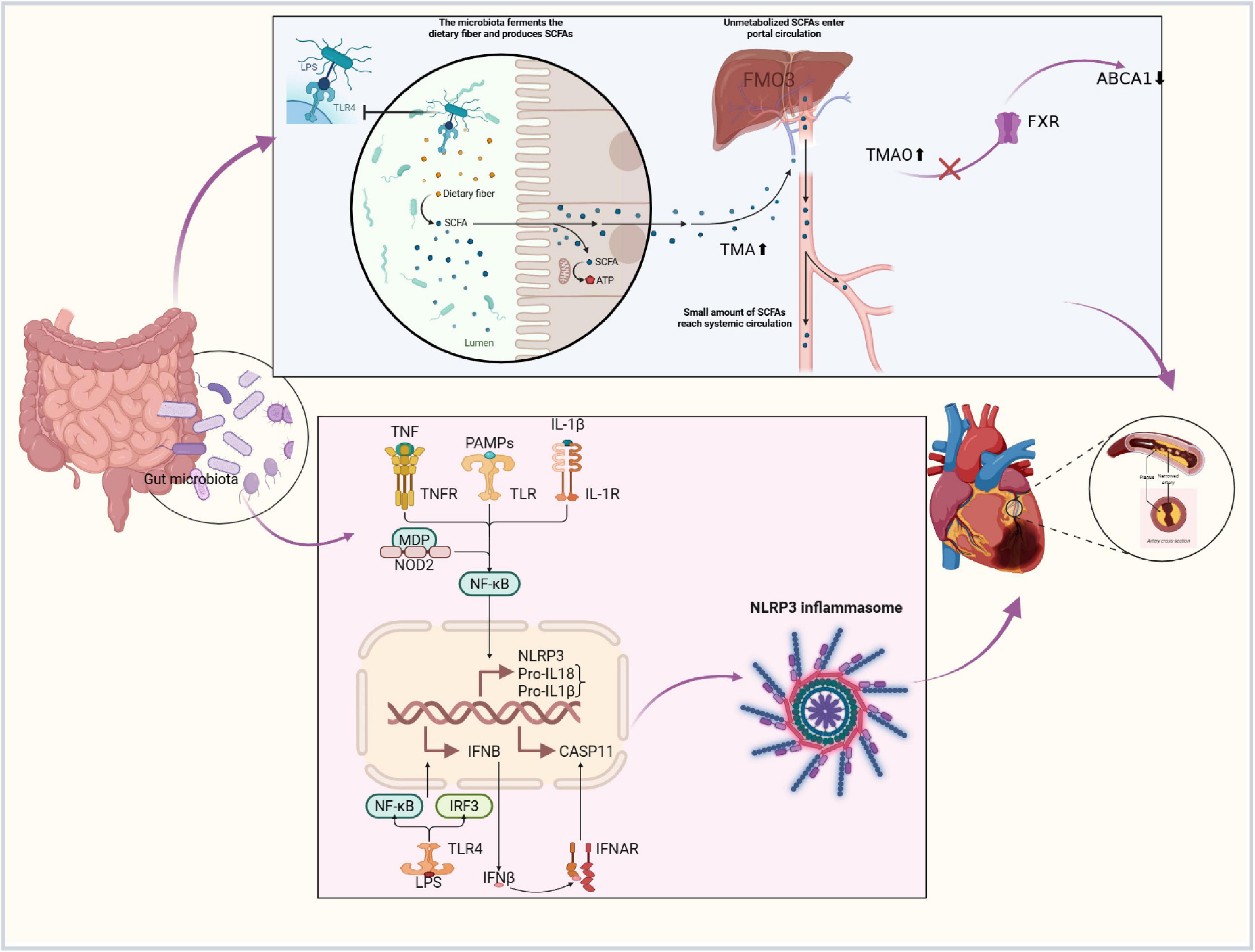 Dietary nutrients, such as choline and L-carnitine, are metabolized by specific gut microbiota, such as Clostridium spp and Lactobacillus spp, to produce trimethylamine (TMA), which is subsequently oxidized in the liver by flavin-containing monooxygenase 3 (FMO3) to form trimethylamine N-oxide (TMAO). TMAO inhibits the farnesoid X receptor (FXR) signaling pathway, leading to reduced expression of the cholesterol efflux transporter ABCA1, thereby promoting macrophage foam cell formation and expansion of the lipid core of atherosclerotic plaques (61). Meanwhile, TMAO activates the NLRP3 inflammasome and the platelet TLR4/ERK5 pathway, inducing IL-1β release and further enlarging the plaque necrotic core (62), and it also enhances platelet P2Y12 receptor signaling, thereby promoting thrombosis (63). Additionally, tryptophan and tyrosine are metabolized by gut microbes, such as Bacteroides spp, leading to activation of the aryl hydrocarbon receptor (AhR), which induces reactive oxygen species (ROS) accumulation in endothelial cells, resulting in mitochondrial dysfunction and endothelial senescence (64, 65).