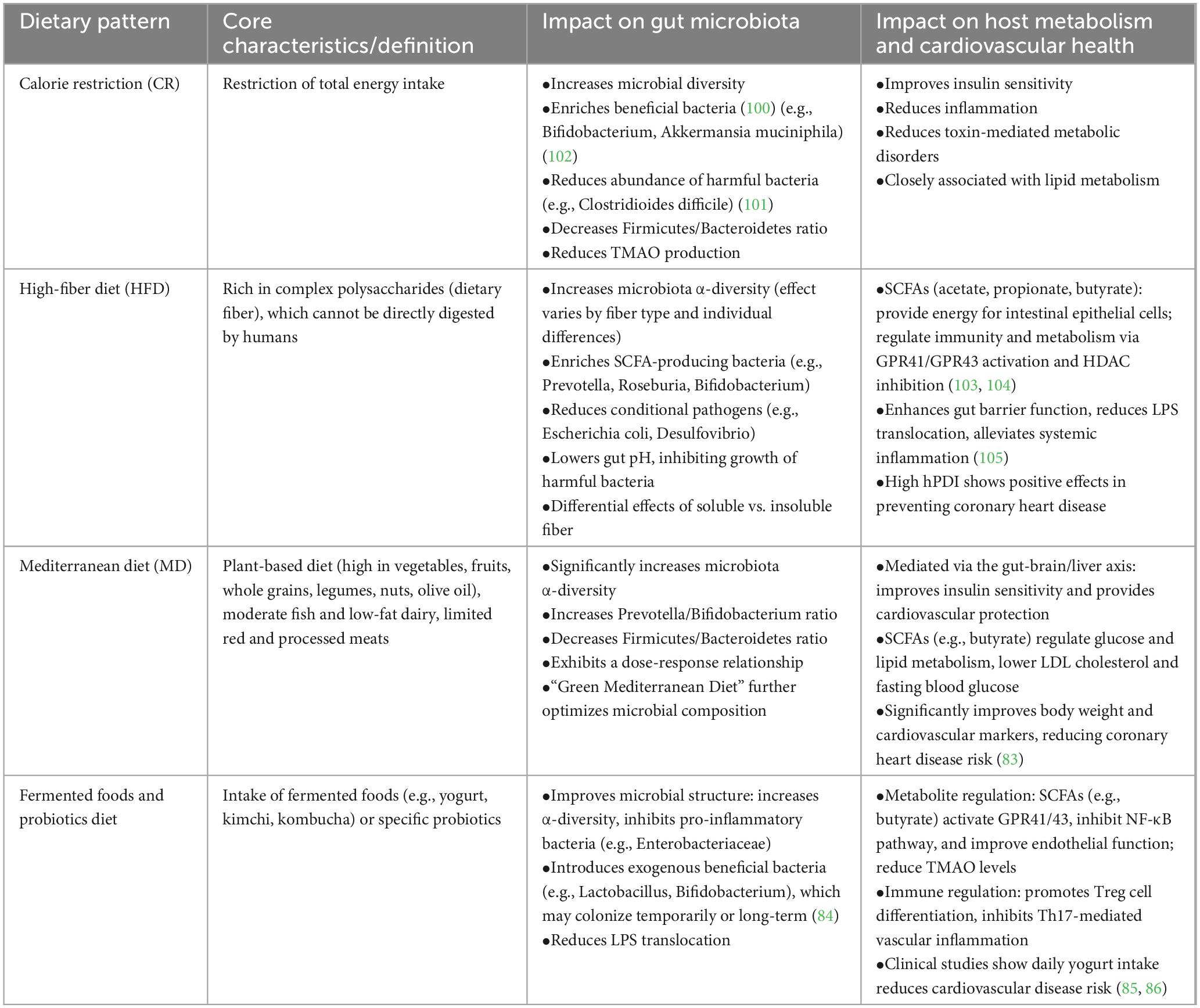 The gut microbiota and the host exert mutual influences on each other. Certain exposure factors may cause gut microbiota dysbiosis, characterized by a reduction in some intestinal probiotics, ultimately contributing to the development of one or more diseases. On the other hand, during the natural aging process of the body, factors such as declining immune function, alterations in the number and activity of related cells in the intestine will also cause changes in the abundance of gut microbiota. These microbial shifts, in turn, may affect other organs or physiological systems through multiple mechanisms. Given the bidirectional regulatory relationship between gut microbiota and CHD, various dietary interventions have demonstrated cardiovascular protective effects (82–86). We have collated the effects of different dietary patterns on gut microbiota and cardiovascular health (Table 1).