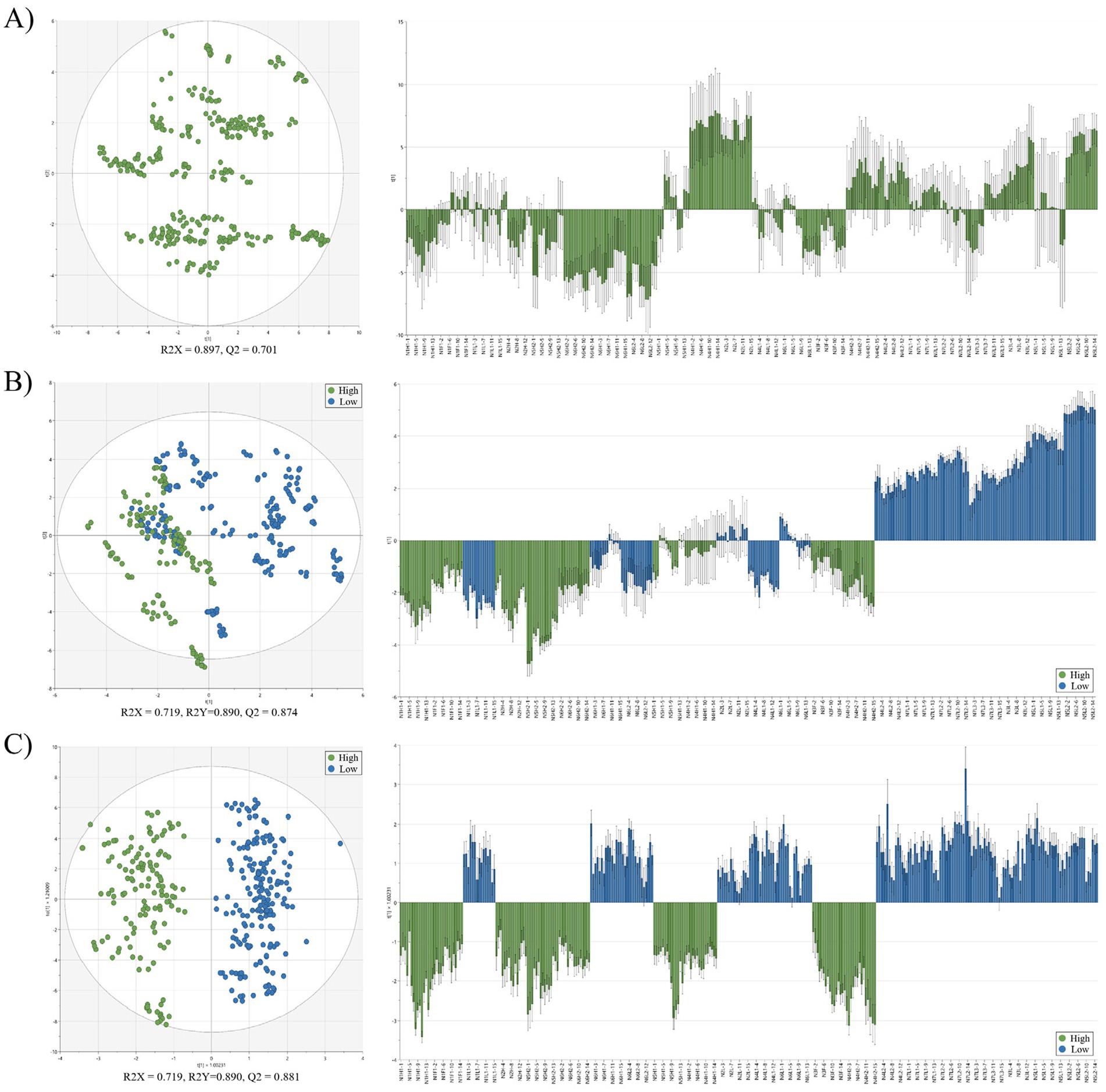 Figure 1. Multivariate analysis of proximate composition and amino acid profiles in raw laver (Pyropia spp.) samples collected from Seocheon between January and March 2024. (A) Principal component analysis (PCA) score plot and loading plot; (B) partial least squares discriminant analysis (PLS-DA) score plot and loading plot; (C) orthogonal partial least squares discriminant analysis (OPLS-DA) score plot and loading plot. High and low groups are indicated by different colors. R2X, R2Y, and Q2 values represent model fit and predictive ability.
