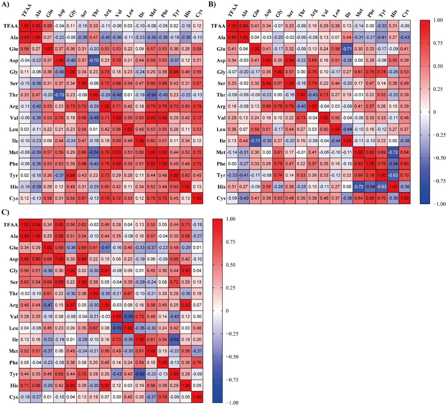Figure 2. Heatmap visualization of Pearson correlation coefficients among free amino acids in raw laver (Pyropia spp.) samples collected from Seocheon (January–March 2024), classified into three quality groups based on total free amino acid (TFAA) content: (A) high, (B) medium, and (C) low. *Color intensity represents the strength and direction of pairwise correlations. Positive correlations are shown in red, and negative correlations in blue.