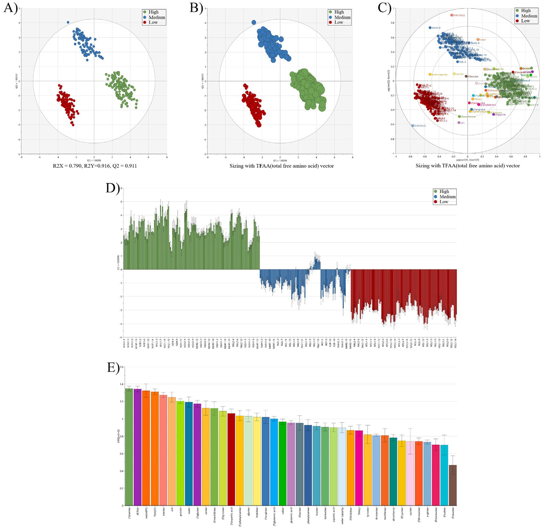 Figure 3. Multivariate discriminant analysis of raw laver (Pyropia spp.) samples reclassified (3 groups, high; medium; low) based on total free amino acid (TFAA) content. (A) Partial least squares discriminant analysis (OPLS-DA) score plot showing separation of high, medium, and low groups (R2X = 0.700, R2Y = 0.916, Q2 = 0.911); (B) OPLS-DA score plot with TFAA vector sizing to visualize the influence of total free amino acid content on sample classification; (C) OPLS-DA biplot combining score and loading vectors, illustrating the correlation between samples [green, blue, red circles (●)] and variables (amino acids/nutritional components (●), colored circles); (D) loading contribution plot showing variable contributions for discriminating high, medium, and low TFAA groups; (E) variable importance in projection (VIP) scores ranking the most significant amino acids contributing to group classification. *Sample groups are color-coded: green (high), blue (medium), and red (low). Model validation parameters R2X, R2Y, and Q2 indicate model reliability and predictive capability. *(C) Nutrient components (e.g., glutamic acid, alanine, aspartic acid) clustered near the high-TFAA group (green) indicate their significant contribution to the group’s distinct profile, suggesting higher abundance and diversity of these compounds in high-TFAA groups samples.