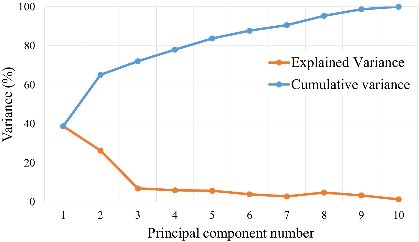 Figure 4. Explained variance ratio (red) and cumulative variance ratio (blue) for the first 10 principal components (PCs) used in the PLS-DA model.