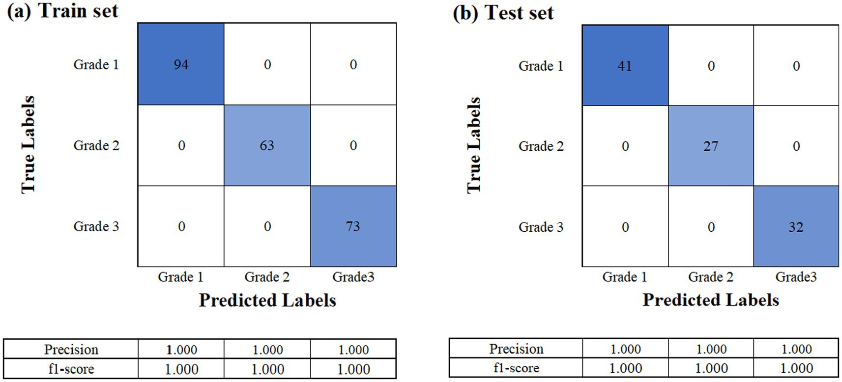 Figure 5. Confusion matrices of the PLS-DA classification model for raw laver grade prediction. (a) Confusion matrix for the training set (n = 230), (b) confusion matrix for the test set (n = 100).