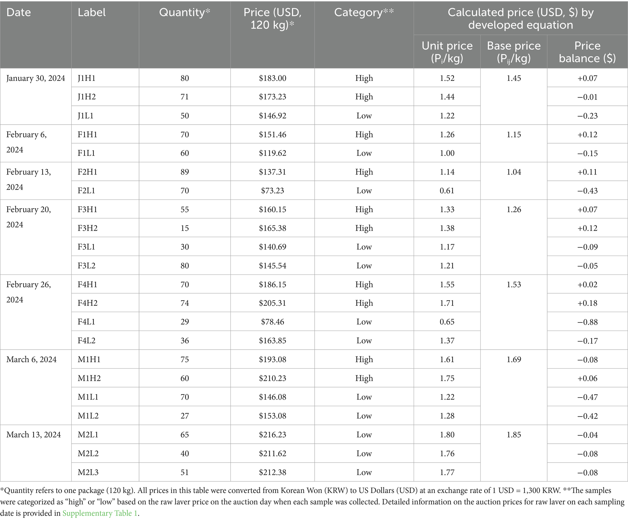 Table 1. List of raw laver (Pyropia spp.) samples collected from the Seocheon region between January and March 2024, including production quantity, auction price, grade category, and calculated base price.