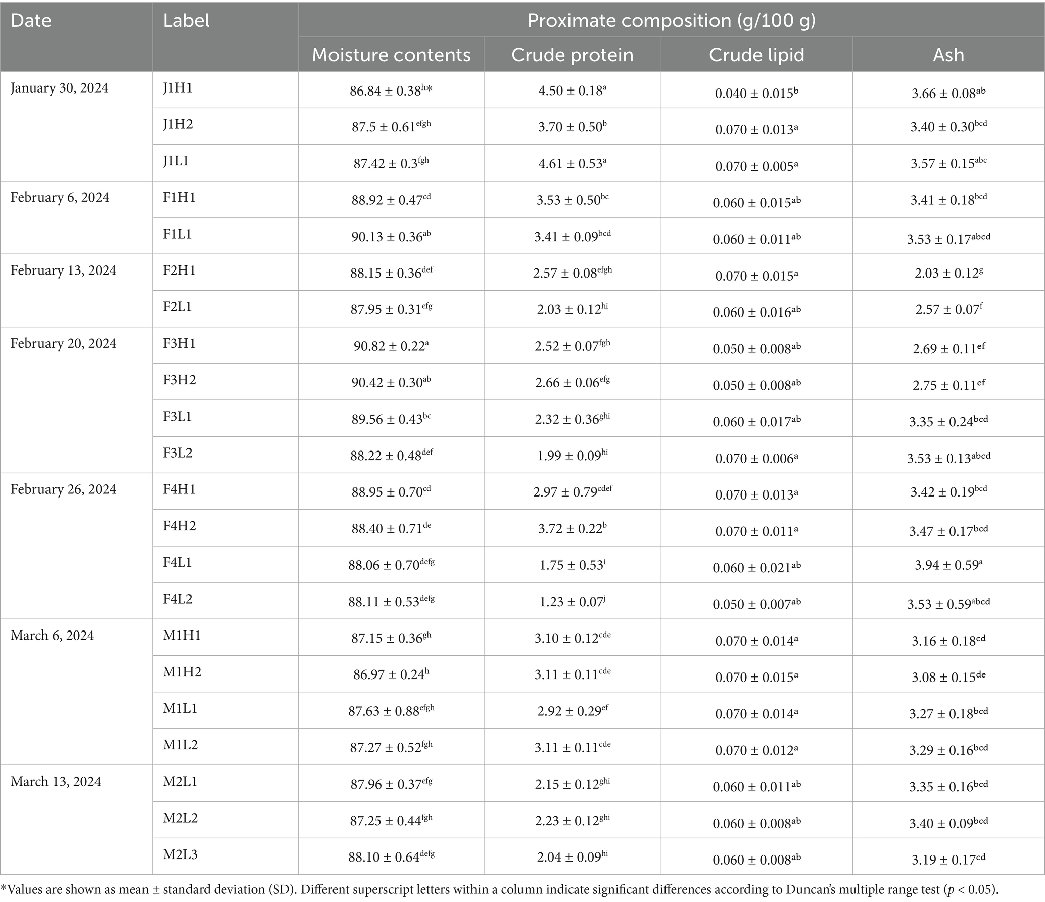 Raw laver samples collected from Seocheon between January and March 2024 are summarized in Table 1. Proximate composition analysis revealed the following ranges: a moisture content of 86.84–90.82%, a crude protein content of 1.23–4.61 g/100 g, a crude lipid content of 0.040–0.070 g/100 g, and an ash content of 2.03–3.94% (Table 2). Moisture content showed significant seasonal variation, with the highest value (90.82% ± 0.22%) observed in sample F3H1 (February 20) and the lowest (86.84% ± 0.38%) in sample J1H1 (January 30). These results align with Mok et al. (27), who reported moisture levels of 89.9% ± 1.4% in raw laver (Pyropia yezoensis) from Korean coastal waters, reflecting physiological changes across the harvest season. Crude protein content was relatively higher in January (3.70–4.61 g/100 g) and decreased by March, reaching a minimum of 1.23 ± 0.07 g/100 g in sample F4L2 (February 26). This pattern supports earlier findings that total amino acid content in Pyropia species declines from November to March (27). Crude lipid levels remained consistently low across all samples (0.040–0.070 g/100 g), consistent with Dawczynski et al. (28), who reported lipid contents of around 1% in edible seaweeds. The lowest lipid content (0.040 ± 0.015 g/100 g) was recorded in the January sample J1H1. Ash content peaked at 3.94% ± 0.59% in sample F4L1 (February 26) and dropped to a minimum of 2.03% ± 0.12% in sample F2H1 (February 13). When converted to dry weight (15–30%), these values are consistent with ash contents reported in Seocheon laver (29). January samples (J1H1, J1H2, and J1L1) showed relatively high ash levels (3.40–3.66%), which decreased mid-February (2.03–2.57%) and increased again in late February and March. These fluctuations likely reflect seasonal shifts in seawater mineral content and the physiological state of the laver (29, 30). The seasonal decline in crude protein content correlated with developmental stages and environmental factors. On a dry weight basis (10–35%), the protein content fell within the expected range for Porphyra species, such as Portuguese samples (23.7%) (31). Similarly, the ash content (15–30% dry weight) was lower than that of Canadian Porphyra spp. (12.23–26.30%) (32) but comparable to that of Portuguese samples (19.07%). These differences may be attributed to regional variations in seawater chemistry, environmental conditions, and species-specific traits. Environmental factors have a pronounced impact on the proximate composition and safety profile of raw laver. Park et al. (33) reported that crude protein content decreases significantly with increasing sea surface temperature (VIP = 2.00, r = −0.695, p < 0.05), while cadmium accumulation increases as salinity decreases (VIP = 1.69, r = −0.667, p < 0.05). These findings align with the observed seasonal fluctuations in moisture, crude protein, lipid, and ash contents in samples collected from Seocheon between January and March 2024. Seasonal declines in protein and shifts in ash content likely reflect both physiological changes and environmental variability, including seawater temperature and salinity (33). Integrating real-time monitoring of these environmental factors with biochemical analysis provides a robust framework for optimizing harvest timing and improving quality control, supporting sustainable production in the seaweed aquaculture industry.
