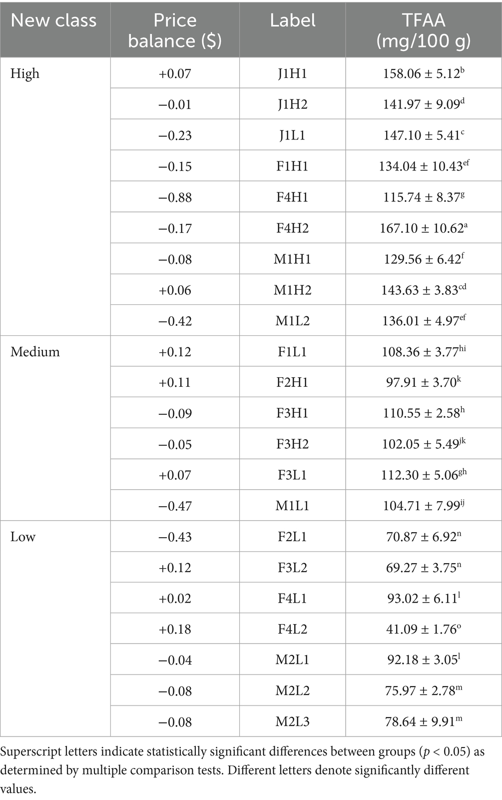 Table 3. Three-tier grading system of raw laver (Pyropia spp.) samples from Seocheon (January–March 2024), reclassified by total free amino acid (TFAA) content, along with corresponding market price balance information.