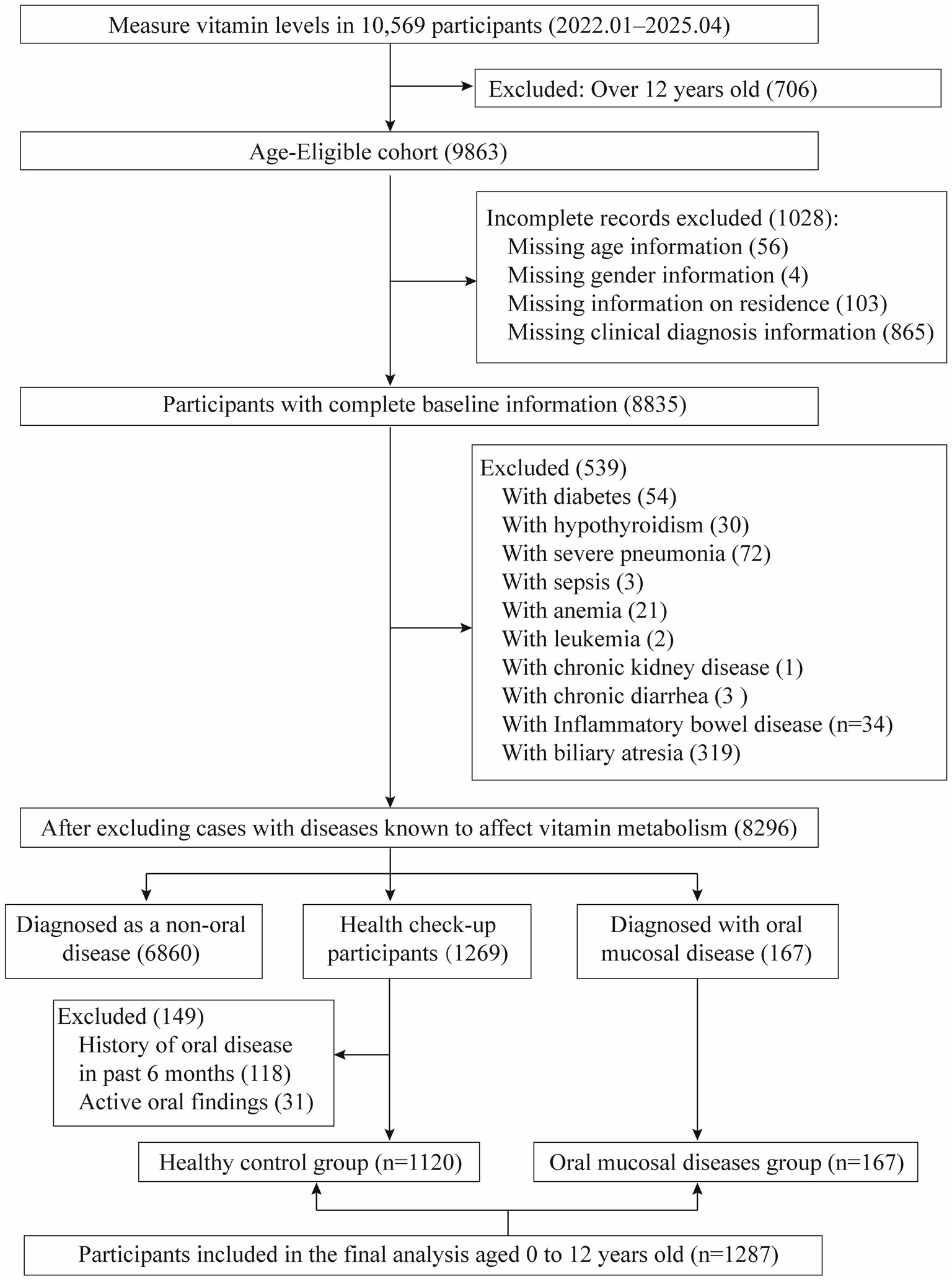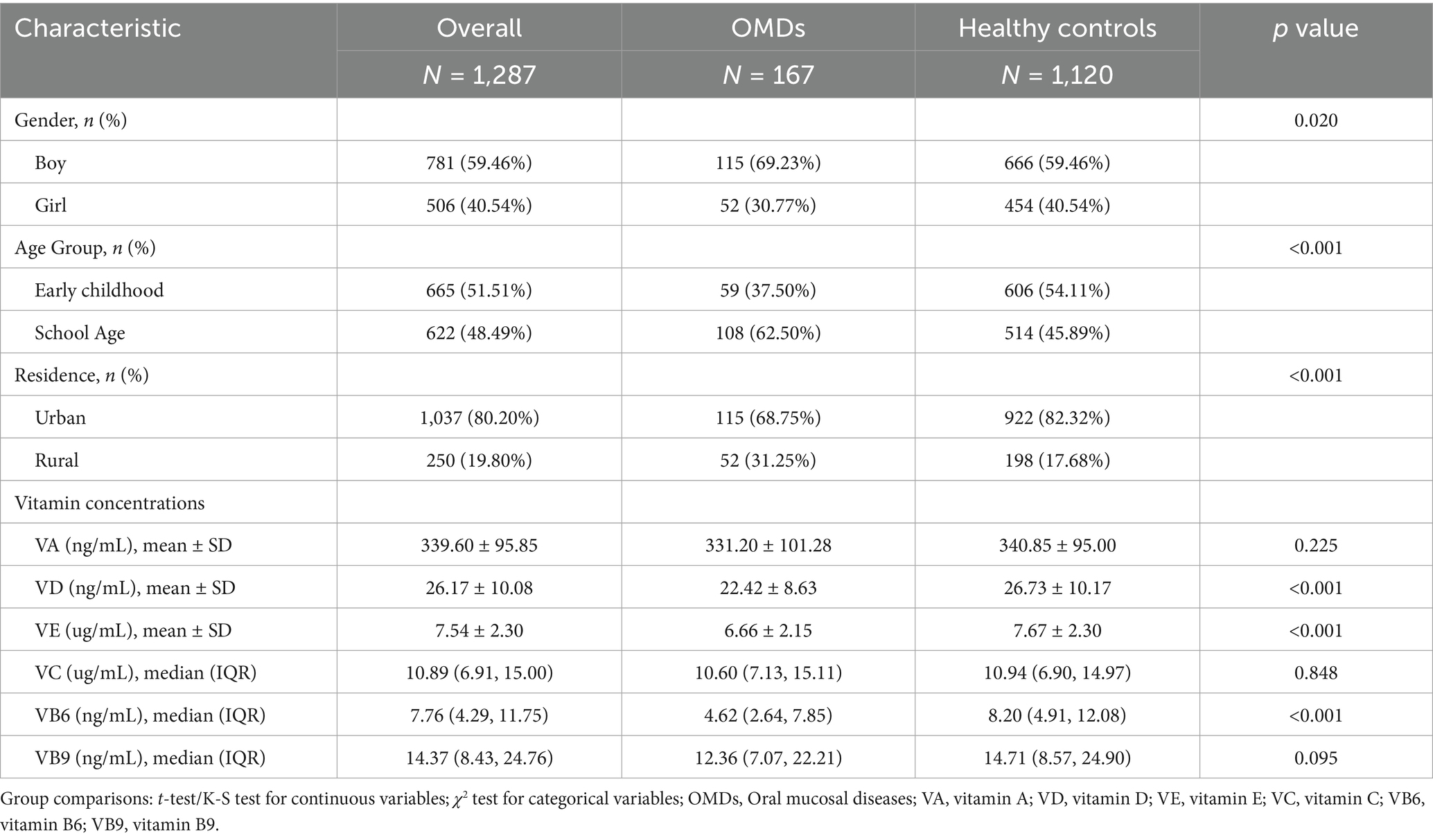 The retrospective case–control analysis was performed at the Children’s Hospital Affiliated to Zhengzhou University. We reviewed medical records of pediatric patients (n = 10,569) who underwent vitamin testing between January 2022 and April 2025. After applying stringent inclusion criteria, 1,287 subjects were eligible for final analysis, comprising 167 cases with OMDs and 1,120 healthy controls from routine health examinations. Diagnosis of OMDs (Recurrent oral aphthous ulcers, cheilitis, etc.) was confirmed by pediatric dentists using World Health Organization (WHO) (17, 18) and the clinical guidelines of the American Academy of Pediatric Dentistry (AAPD) (19). All case records were extracted from the clinical database and underwent secondary verification by our research team to ensure rigorous and consistent case selection. Exclusion criteria comprised: (1) lack of essential demographic data (e.g., missing age, sex, or residential information); and (2) presence of underlying conditions known to affect vitamin metabolism, such as diabetes mellitus, hypothyroidism, cholestatic hepatitis, biliary atresia, and severe infectious diseases. Healthy control subjects were selected from children undergoing routine health examinations after applying the aforementioned exclusion criteria, with the following additional criteria applied: (1) no diagnosis of OMDs (either currently or within the past 6 months), as verified through medical records and health questionnaires; (2) free from oral symptoms or lesions (e.g., pain, ulcers, bleeding) at examination. Consequently, the study included 1,287 participants in the final analysis, with the selection process detailed in Figure 1.