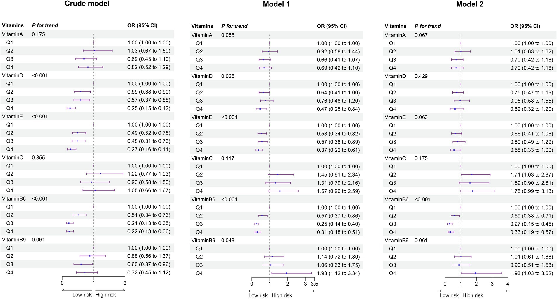 Forest plot comparing odds ratios of serum vitamin levels across three models. For each vitamin (A, D, E, C, B6, and B9), quartiles (Q1-Q4) are shown with odds ratios and 95% confidence intervals. Dotted lines at OR=1 represent no effect. Odds ratios vary, indicating different levels of risk association among models. Significance is shown with P for trend values.