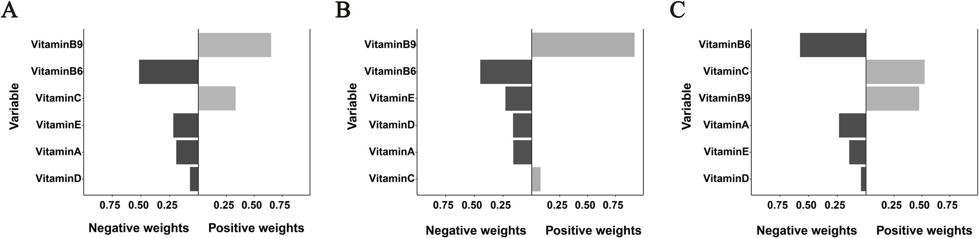 Figure 3. Weighted contributions of individual vitamins to OMDs risk derived from qgComp analysis in (A) the overall population, (B) early childhood, and (C) school-age children. All models were adjusted for age, sex, residence, and co-exposure to other vitamins.