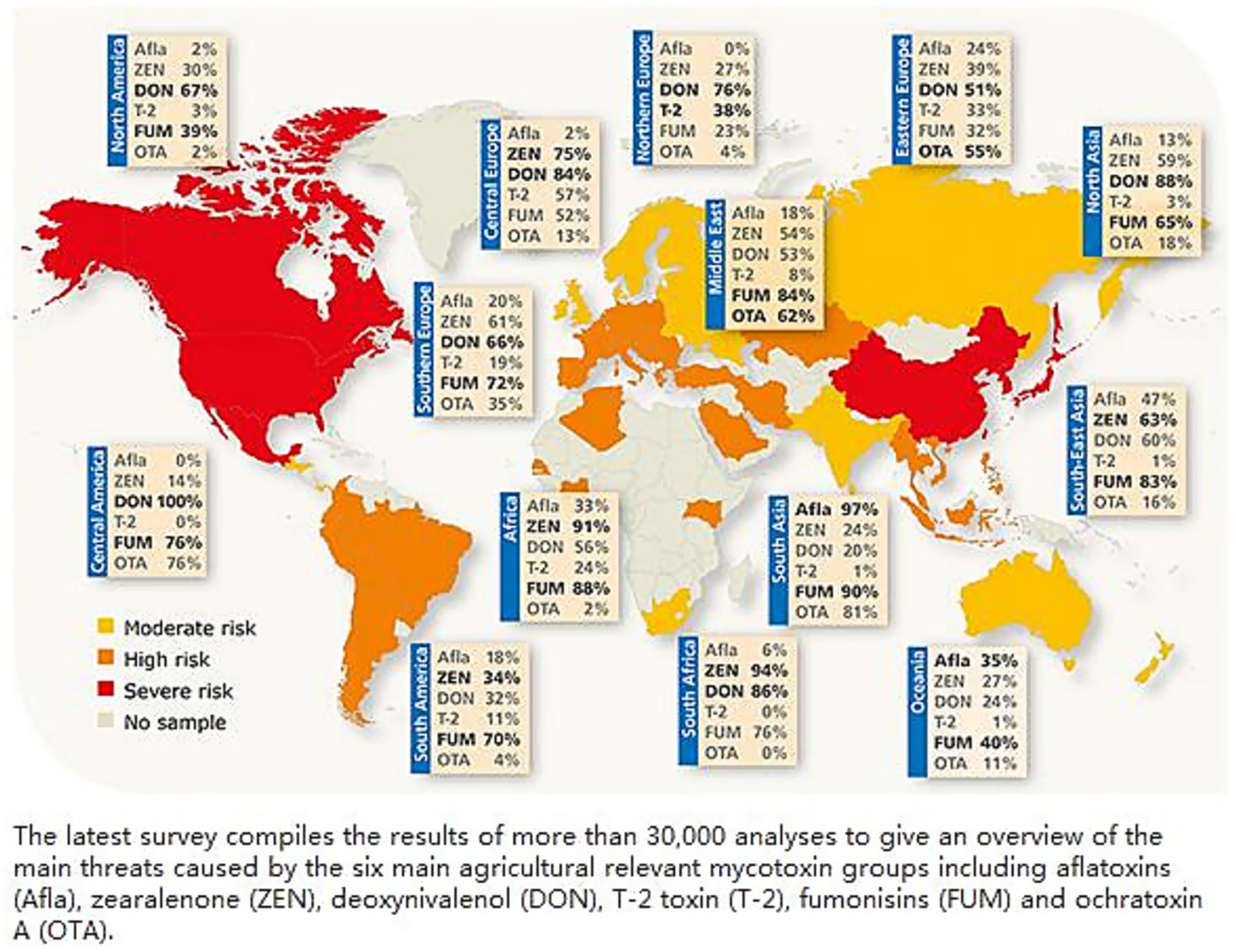 Regions with recurrent high DON incidence (East Asia, North America, Europe) are highlighted.