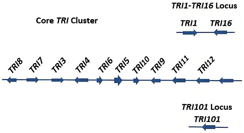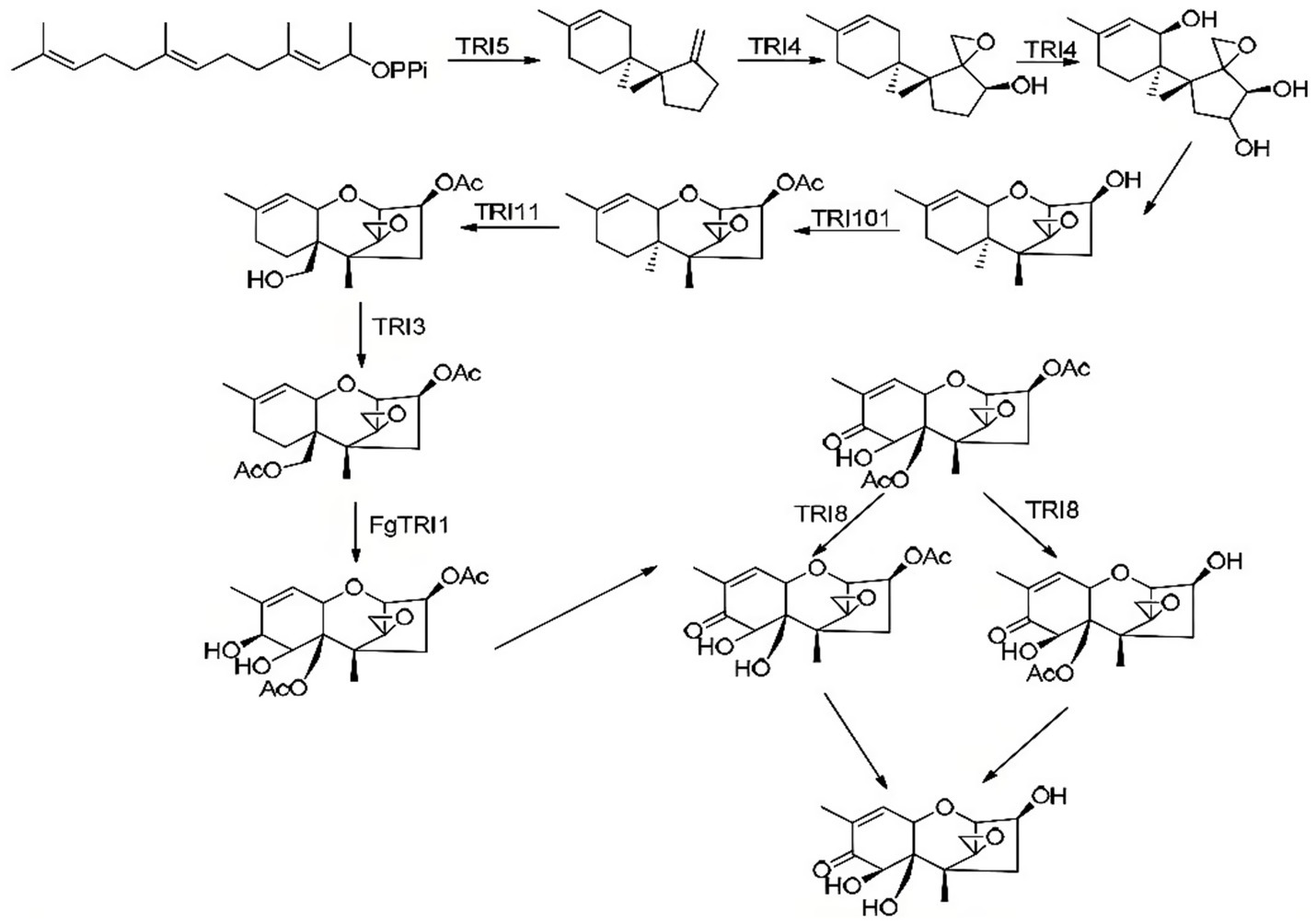 The biosynthesis of DON is regulated by a coordinated enzymatic network encoded by the TRI family (52). All TRI involved in DON biosynthesis in F. graminearum have been identified, which includes nearly 10 core TRI, along with TRI101 and TRI1 through TRI16 (Figure 4). The roles of these genes in DON biosynthesis have been largely elucidated, thereby clarifying the overall biosynthetic pathway (Figure 5).