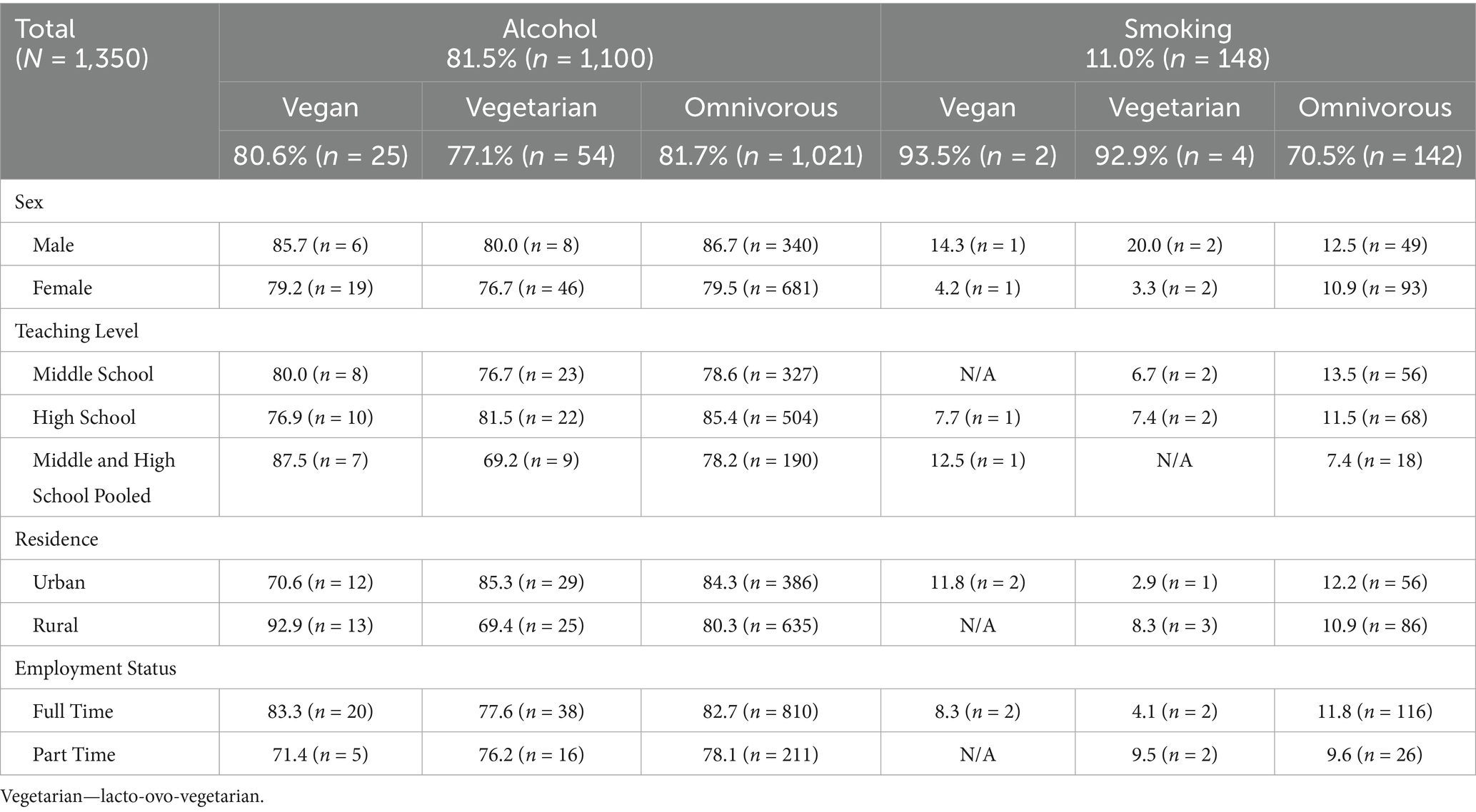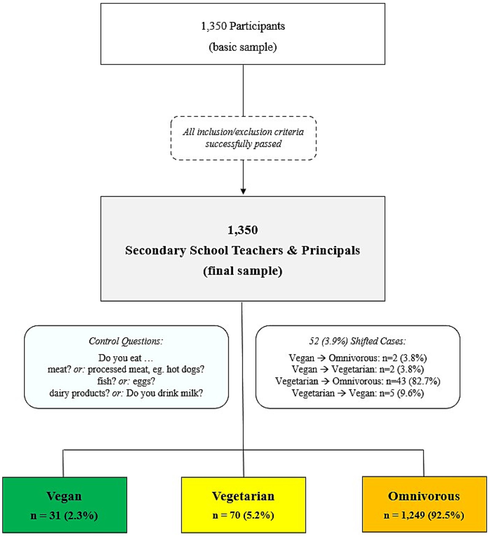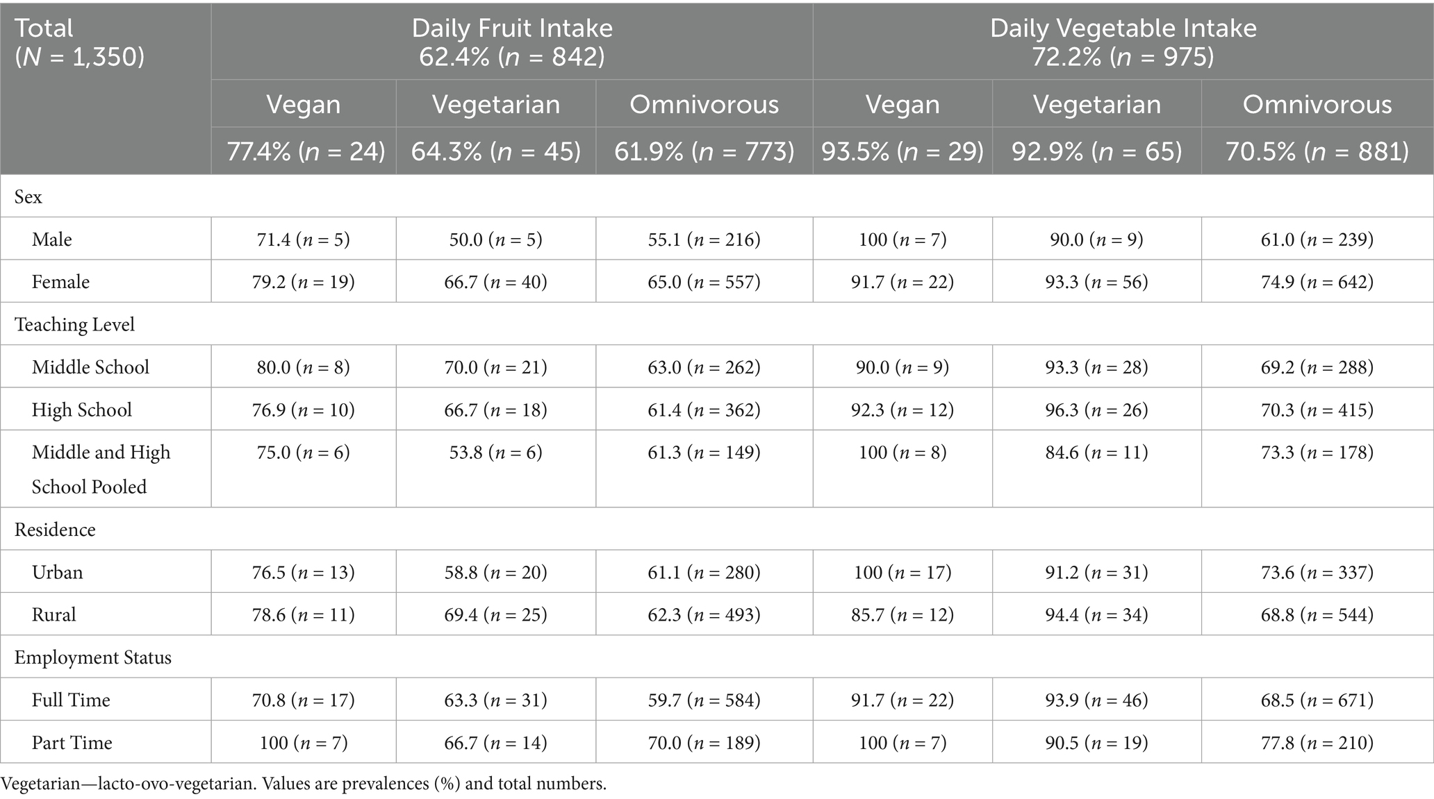 A total of 1,350 secondary school teachers and principals were included in the present study. Most participants followed an omnivorous diet (92.5%; n = 1,249), while 70 (5.2%) and 31 (2.3%) participants followed a vegetarian and vegan diet, respectively. The majority of the omnivorous teachers and principals (91.1%; n = 1,138) reported that this has been their kind of diet for their entire life, while 5.7% (n = 4) reported that they have always consumed a vegetarian diet. Within the previous 5 years, 36.6% of vegetarian dieters and 64.5% of vegan dieters switched to their current diet from previously consuming an omnivorous diet.