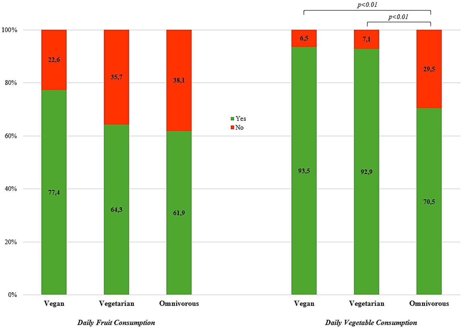 Figure 2. Prevalence (%) of daily fruit and vegetable consumption by diet type (N = 1,350). Vegetarian—lacto-ovo-vegetarian.