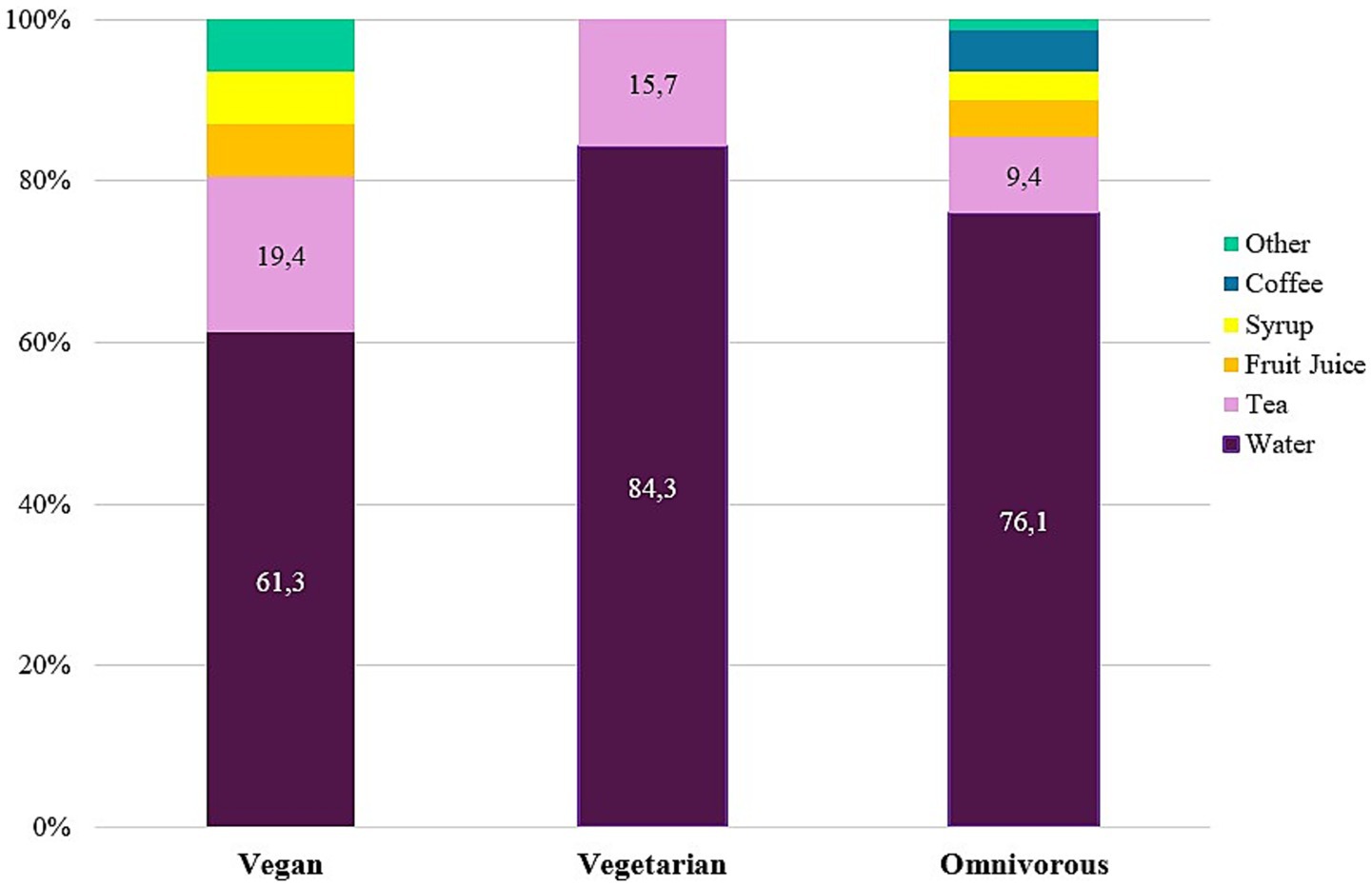 Figure 3. Prevalence (%) of most commonly consumed fluid by kind of diet (N = 1,350). Vegetarian—lacto-ovo-vegetarian.