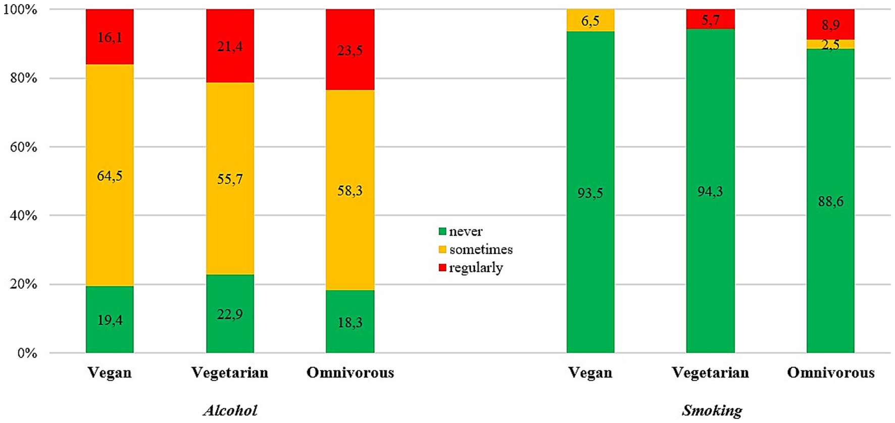 Figure 4. Prevalence of alcohol consumption and smoking by kind of diet (N = 1,350). Vegetarian—lacto-ovo-vegetarian.