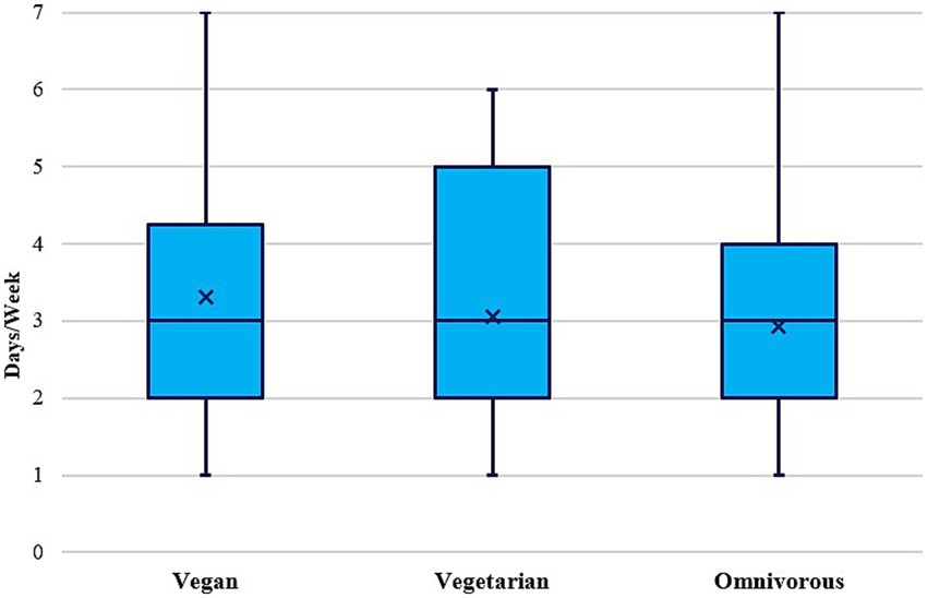 Figure 5. PA, sports & exercise participation (days/week) by diet type (n = 1,197). Vegetarian—lacto-ovo-vegetarian. Note. Values are displayed as median and interquartile ranges, including means (x).