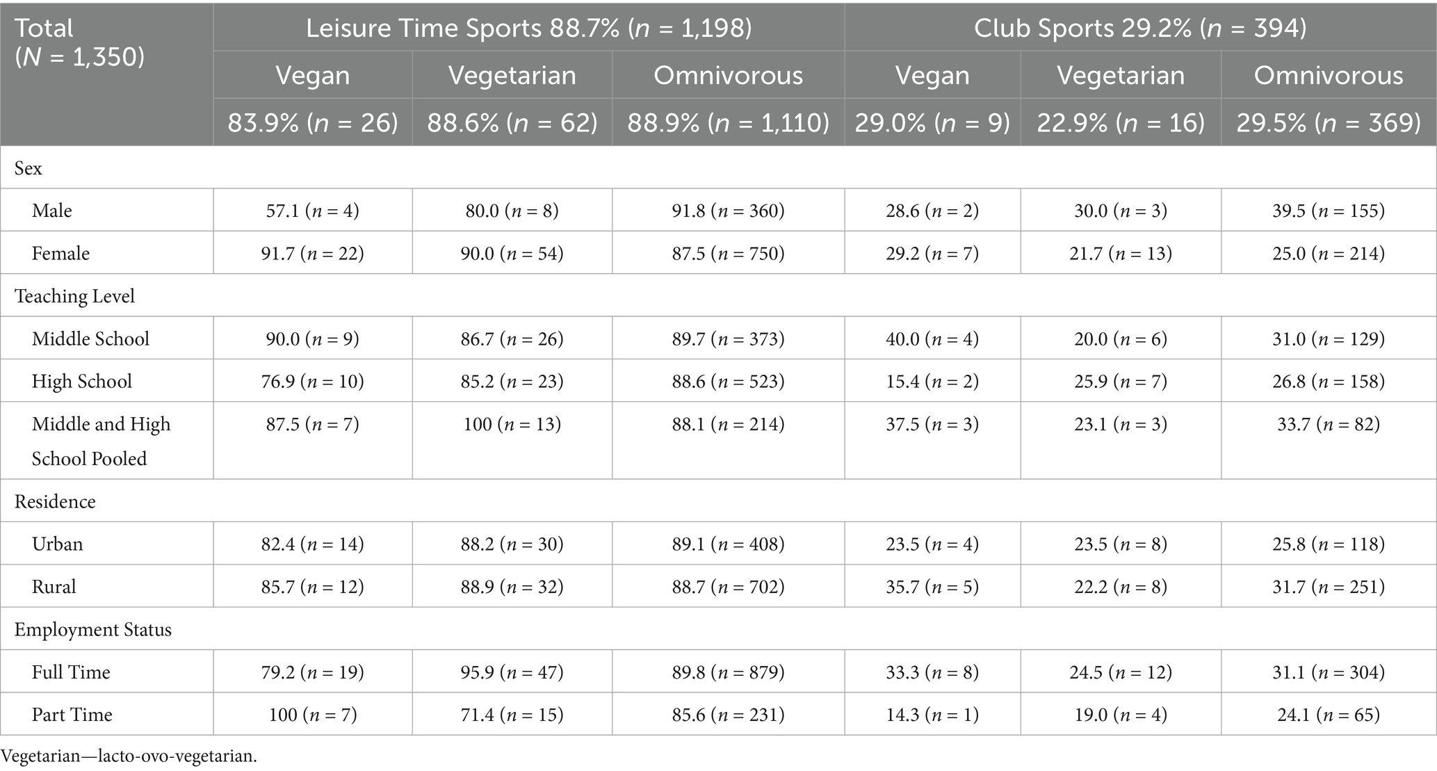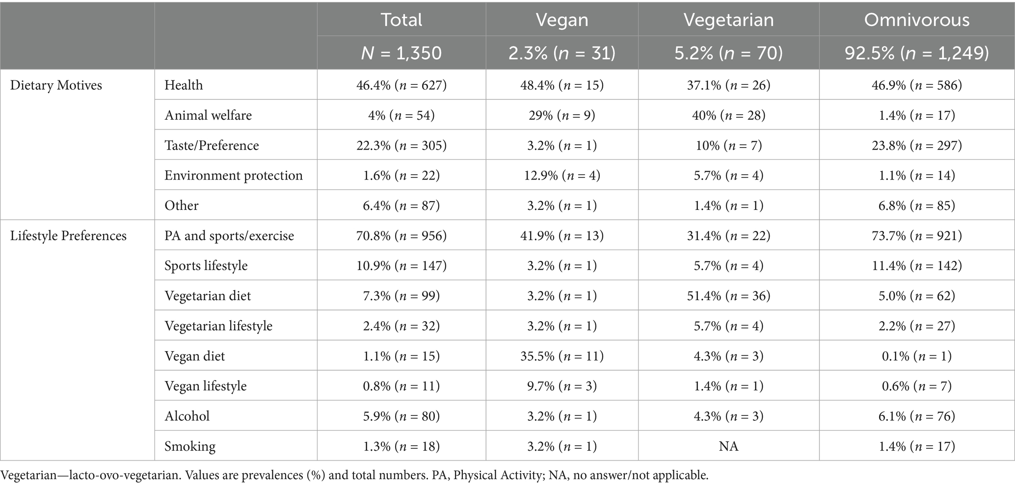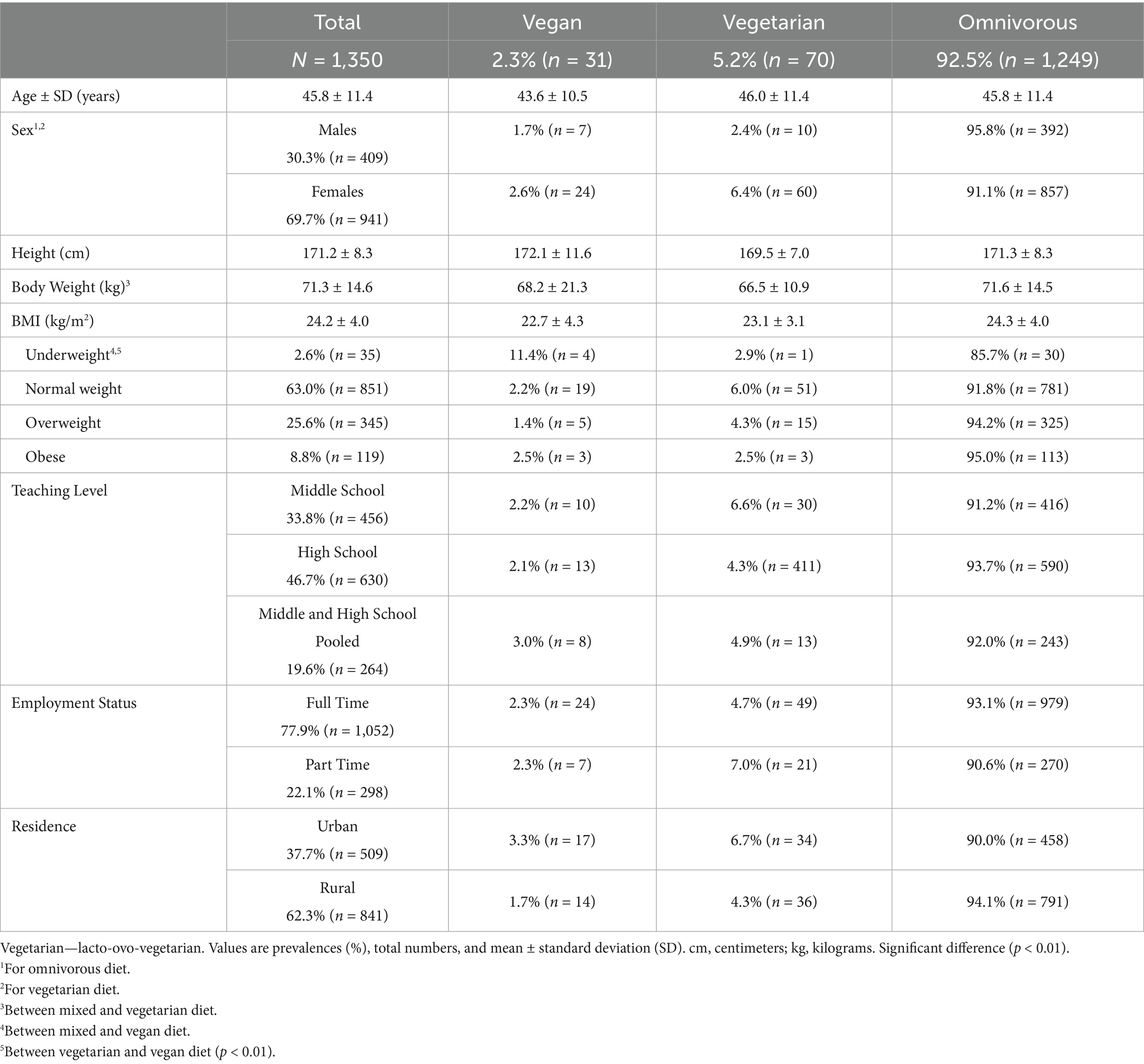 Results: The final sample included 1,350 participants (409 males, 941 females) with an average age of 45.8 ± 11.4 years. Health (46.4%) was the most important reason for dietary choice and sports engagement, and lifestyle (pooled 81.7%) the predominant lifestyle preference across all dietary subgroups. Prevalence of vegan, ovo-lacto-vegetarian and omnivorous diet of school teachers and principals was 2.3%, 5.2%, and 92.5%, respectively. Females were more likely to follow an ovo-lacto-vegetarian diet (6.4% vs. 2.4%; p < 0.01) or vegan/ ovo-lacto-vegetarian (9.0% vs. 4.1%) than males. For total sample, no differences were found across the dietary subgroups considering leisure time physical activity, sports and exercise levels (88.7%; n = 1,197) and weekly engagement in sports (range: 2.9–3.3 days/week), the prevalence of daily fruit consumption (62.4%), alcohol intake (81.5%), or smoking prevalence (11.0%). Vegetable intake was significantly higher among ovo-lacto-vegetarians and vegans (92.9 and 93.5%, respectively; p < 0.01) than in omnivores.