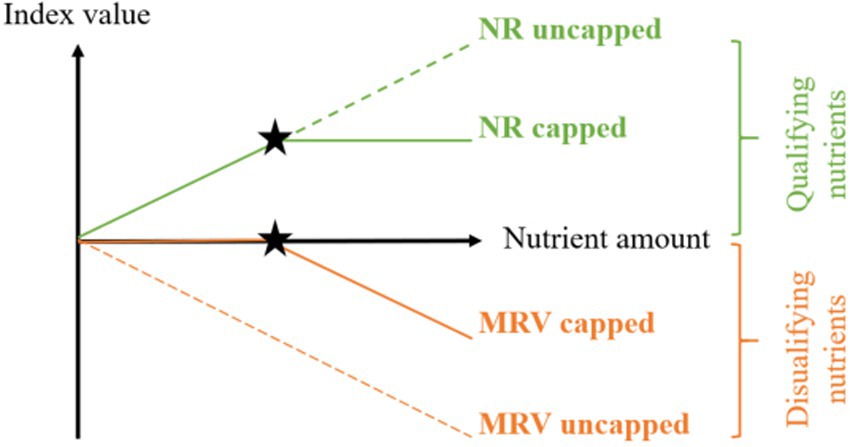 For the analysis at the product level (per 100 g), capping was not applied, as high contents of one nutrient in a food can compensate for low contents in another food (32, 33). However, for the analysis at the diet level (g of food consumed/person/day), capping was applied to qualify nutrients at the maximum level of the DRI (because higher levels of qualifying nutrients do not imply a higher nutritional value in a balanced diet). For disqualifying nutrients at the diet level, nutrient contents were considered only when they exceeded the MRV values (see Figure 1).