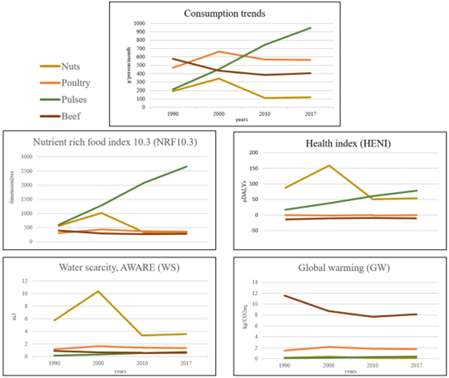 Figure 3. The graphs compare nuts, poultry, pulses, and beef consumption trends from 1990 to 2017. The Consumption Trends graph shows pulses increasing while others fluctuate. The rise in pulses consumption, increase The Nutrient Rich Food Index. The rise in nuts consumption in the year 2000 increase The Health Index and The Water Scarcity. With the decrease in beef consumption, Global Warming decreases.