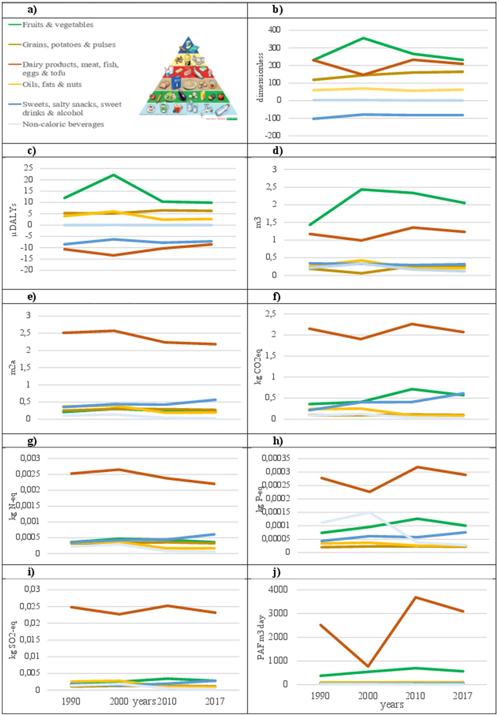 Figure 4. These graphs illustrate various food categories following the Swiss food pyramid labels. Line charts show trends from 1990 to 2017 in various metrics such as nutrient density, microDALYs, water usage, carbon emissions, and other environmental impacts, each color-coded line to match the food pyramid’s categories. These charts depict changes over time across the categories.