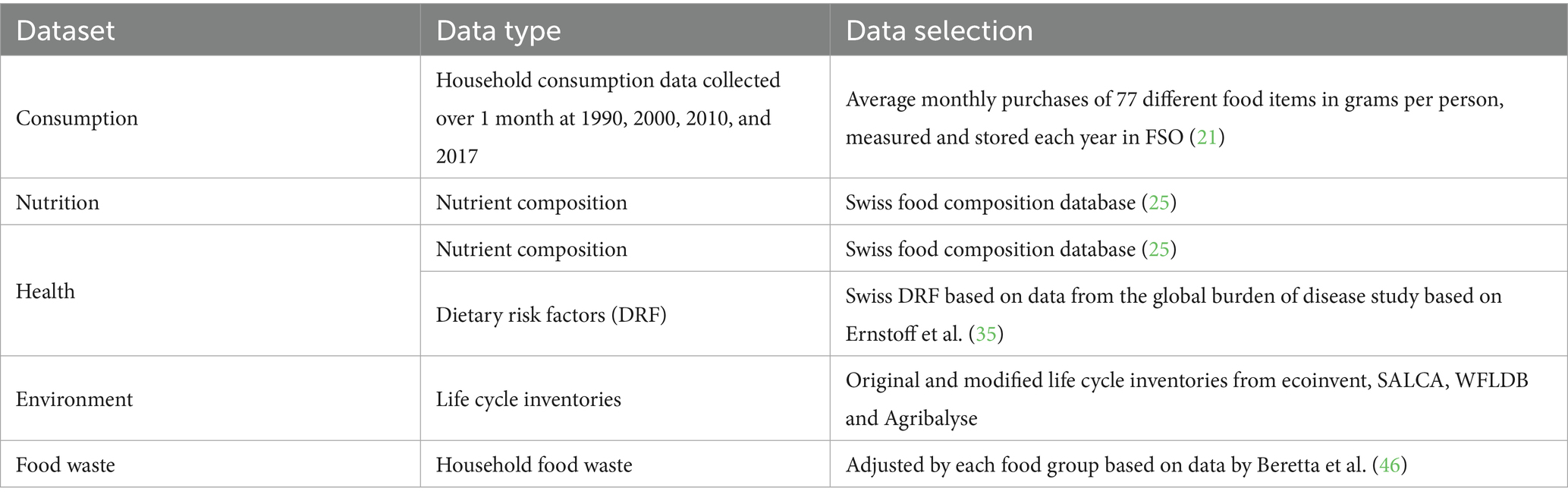 The list of personal characteristics, survey frequency, and food classifications varied over time, and we performed all necessary matching to ensure comparability of the data for the years 1990, 2000, 2010, and 2017. The average amounts of consumption (purchases) per person calculated for this database were similar to official statistics (22) but smaller than declared by some Swiss non-governmental organizations, because the latter use food balances and add restaurant food and foods consumed by tourists to their averages for the population. A main shortcoming of our data is the lack of consideration of shifts from home to out-of-home food consumption. To account for this shortcoming, we considered the share of restaurant food 15% of the total food consumption (19, 23). In addition, the weight declared by households is usually the weight of food before preparation (cooking, pealing), and containing the weight of some bones for meat. This shortcoming might be meaningful [for example for potato weight (24)]. To account for this limitation, we considered food waste and losses at the consumer stage (see Section 2.4), for example, by considering food preparation residuals such as peels. However, we did not account for household cooking methods. While we acknowledge that omitting the cooking stage introduces limitations, we opted for this approach to avoid introducing additional variability and uncertainty relating to variety of household cooking methods which have different impacts on the nutritional content of foods as well on its environmental impacts.