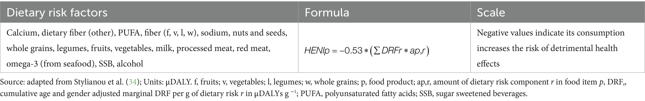 The health dimension was evaluated using the Health Nutritional Index (HENI), as described by Stylianou et al. (34). Swiss dietary risk factors from the global burden of disease study were used based on data by Ernstoff et al. (35). The HENI analysis included 15 dietary risk factors and alcohol consumption (see Table 3). Trans-fatty acids (TFA) were not considered, as their content was not available in the SFCDB database. Trans fatty acid contents in foods have been a health concern in Switzerland in the past, especially in processed foods (36), but large efforts have been undertaken to regulate and reduce their contents (37). Thus, only small differences in the results would be expected if TFA were considered. Stylianou et al. (34) also found that TFA had a relatively small impact on HENI scores for most of the food categories (34). Omega-3 fatty acids were not included in the SFCDB, but as they have considerable relevance to the HENI score (34), and fatty fish is one of the main fishes consumed in Switzerland (19), omega-3 values for seafood (DHA and EPA values) were complemented from the USDA food composition database (38). The HENI score was calculated at the product (per 100 g of food product consumed) and diet (per gram of food consumed/person/day) levels for the 4 years considered in this study. Since we did not consider the cooking stage to avoid adding variability on the data, the HENI index was calculated based on raw products for those bought raw (see Supplementary Table S2 for details of the reference products used for the calculations).