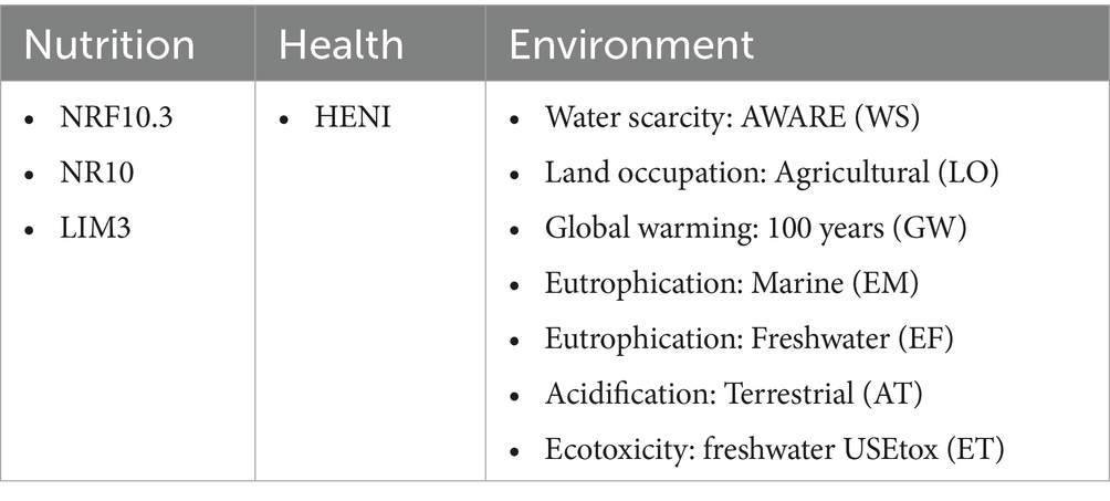 The final list of indices used at the product and diet levels in this study is as follows: