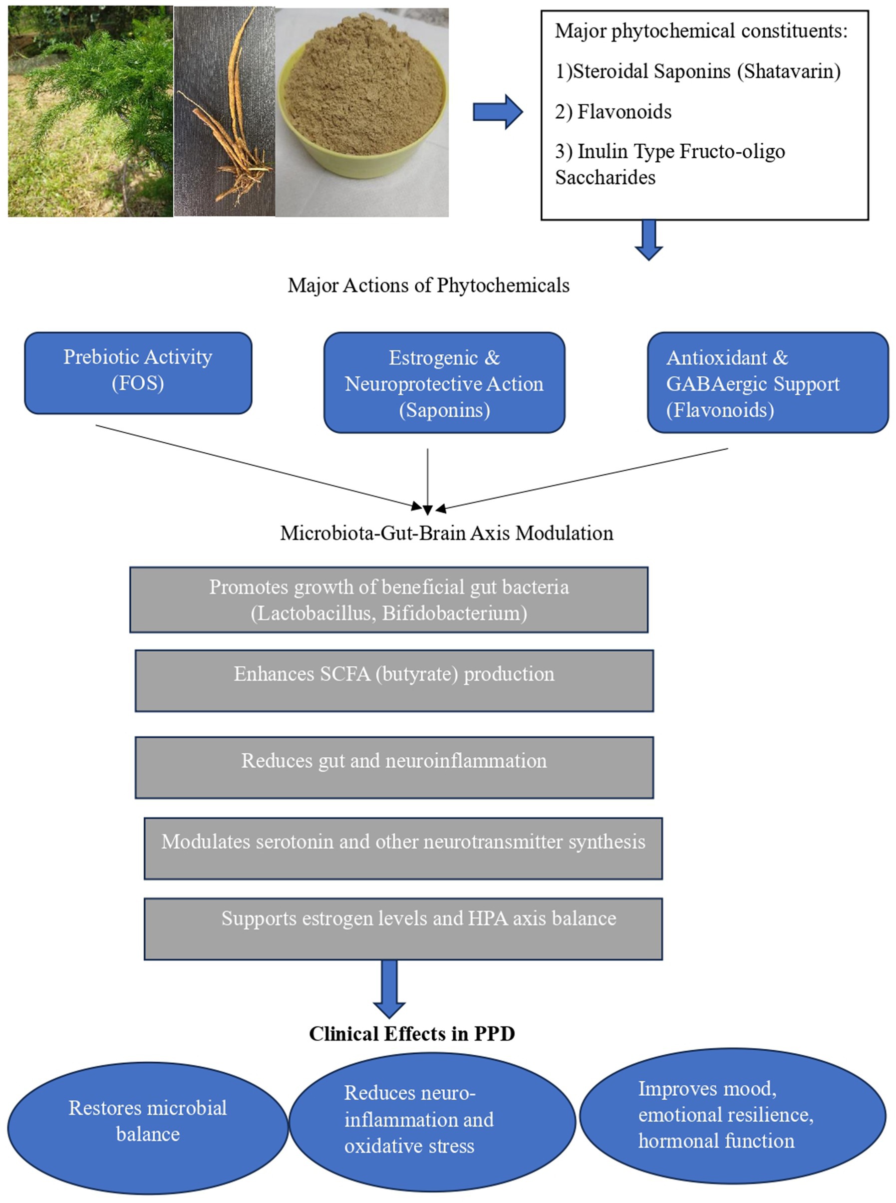 PPD affects approximately 10–20% of new mothers globally, with increased burden in underserved populations (7). Traditional antidepressant therapies face limitations due to lactation safety concerns and stigma, creating a need for low-risk, effective alternatives. The gut-brain axis, a communication network between intestinal microbiota and the central nervous system has emerged as a critical regulator of emotional health (8). Disruption of gut microbiota has been linked to impaired neuroendocrine signaling and altered neurotransmitter production. Psychobiotics, natural compounds that positively influence mental health through the gut represent a novel therapeutic strategy (9). Among these, Asparagus racemosus is gaining recognition for its phytochemical diversity and multifaceted neurobiological potential.