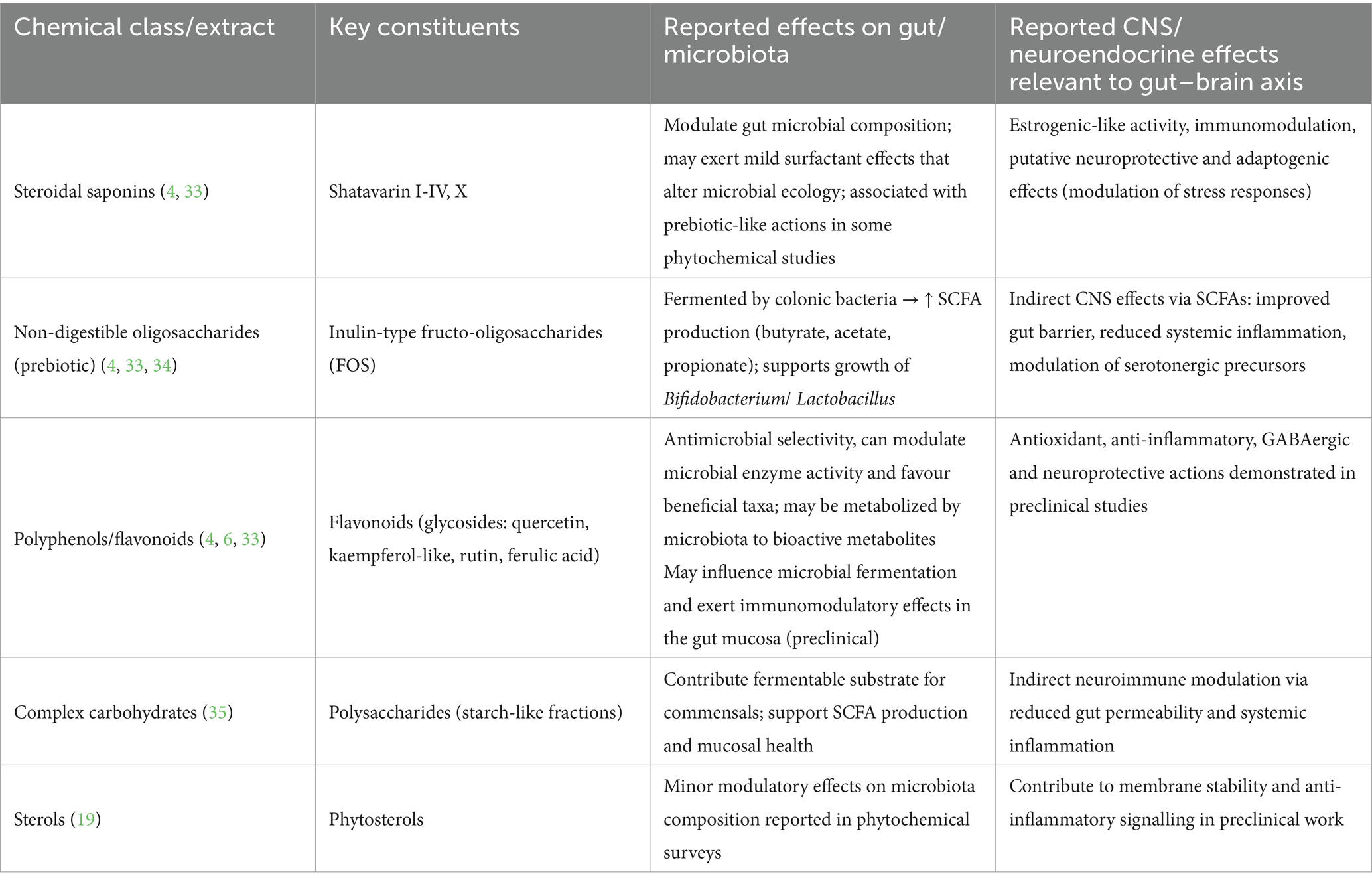 Table 1. Principal phytochemicals of Asparagus racemosus (Shatavari) and reported effects relevant to the gut–brain axis.