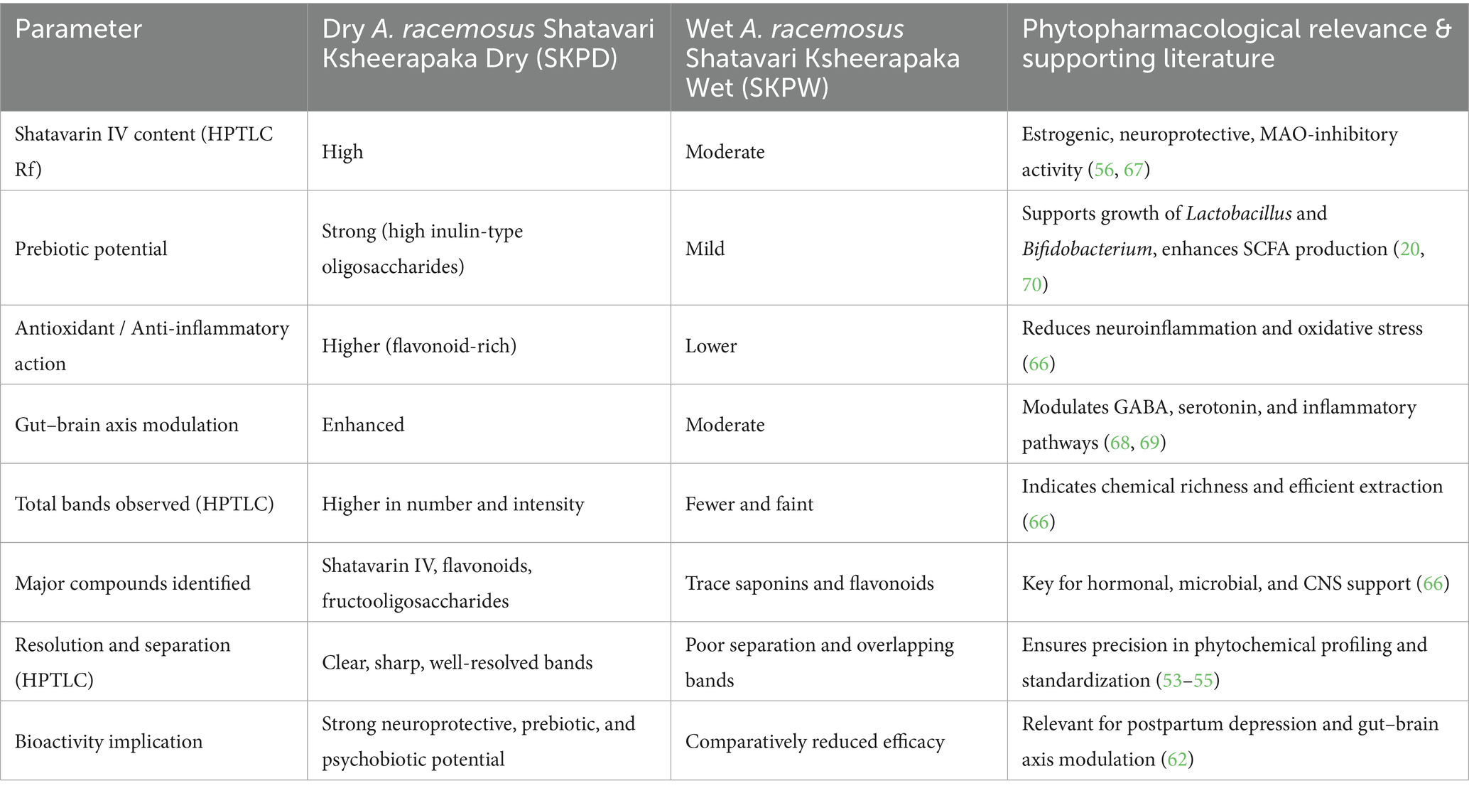 The enhanced separation and resolution seen in HPTLC further validate the superior chemical integrity of dry root preparations, offering a reproducible and standardized method for quality control in psychopharmacological applications (71). These phytochemical insights justify the preferential use of dry A. racemosus root in therapeutic formulations targeting the gut-brain axis, particularly in sensitive populations such as postpartum mothers. The integration of HPTLC data with pharmacodynamic understanding underscores Asparagus racemosus (Shatavari) (72) as a potent neuro-gut modulator. Its phytochemical constituents target hormonal, inflammatory, and microbial dysregulations central to postpartum depression, positioning it as a promising plant-based intervention in integrative neuropsychiatry (56).