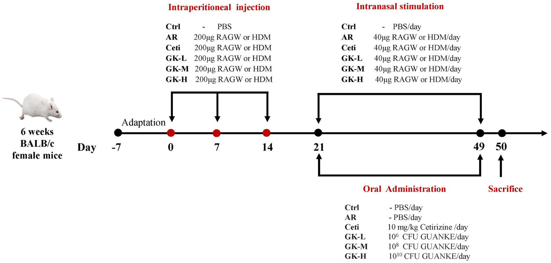 We established two AR mouse models induced by either RAGW or HDM. Each AR model involved 60 BALB/c mice, which were randomly divided into six groups (n = 10 per group) as follows: (1) normal control group (Ctrl), (2) AR model group (AR), (3) AR group treated with Cetirizine (Ceti), (4) AR group treated with 106 CFU of GUANKE strain (GK-L), (5) AR group treated with 108 CFU of GUANKE strain (GK-M), (6) AR group treated with 1010 CFU of GUANKE strain (GK-H). Figure 1 summarizes the sensitization methods of either RAGW or HDM, as well as the treatment schedule of the GUANKE strain. On days 0, 7, and 14, the Ctrl group mice were intraperitoneally injected with 200 μL PBS; other mouse groups were intraperitoneally injected with 200 μL PBS containing 200 μg of either RAGW or HDM and 2 mg of aluminum hydroxide. From day 21 to day 49, all mice in each experimental group were locally sensitized through daily intranasal challenges, with 10 μL PBS being dropped into each nostril in the Ctrl group and 10 μL PBS containing 20 μg either RAGW or HDM being dropped into each nostril in other mouse groups. After daily intranasal challenges, the AR groups treated were orally administered either 200 μL Ceti (10 mg/kg) or three different doses of GUANKE strain (106, 108, or 1010 CFU /mouse) once a day, while the Ctrl group and the untreated AR group were orally administered 200 μL of PBS. On day 50, serum and nasal mucosal samples were collected from each mouse under anesthesia for further analysis.
