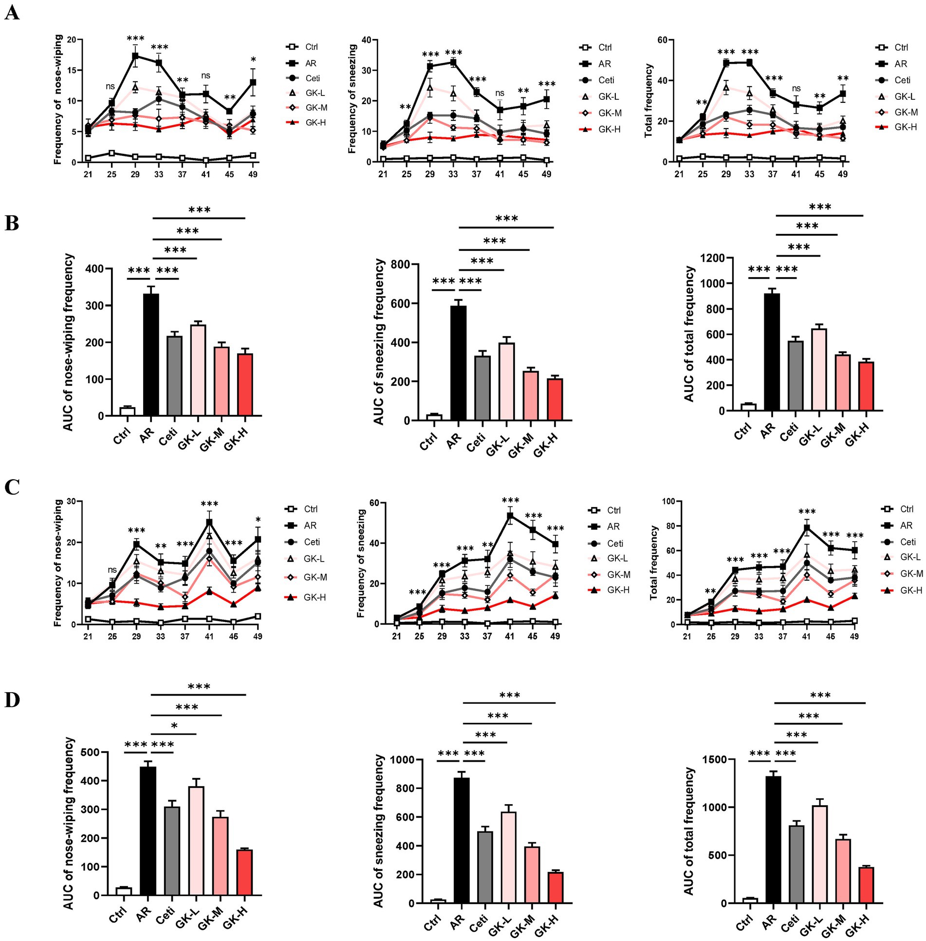Figure 2. The effect of GUANKE strain on AR symptoms induced by either RAGW or HDM in mice. From day 21 to day 49, the nose-wiping frequency, sneezing frequency, and their combined frequency in the RAGW-induced AR model (A) or HDM-induced AR model (C) (n = 10). The “*” or “ns” in A,C represents the p-value of the AR group compared to the GK-H group. From day 21 to day 49, the AUC of nose-wiping frequency, sneezing frequency, and their combined frequency in the RAGW-induced AR model (B) or HDM-induced AR model (D) (n = 10). The data are presented as the mean ± SEMs. ns, not significant; *p < 0.05; **p < 0.01; ***p < 0.001. RAGW, ragweed pollen; HDM, house dust mite; Ctrl, control; AR, allergic rhinitis; Ceti, Cetirizine; GK-L, low-dose GUANKE (106 CFU); GK-M, middle-dose GUANKE (108 CFU); GK-H, high-dose GUANKE (1010 CFU).