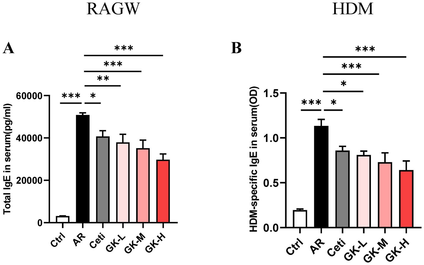 Figure 3. The effect of GUANKE strain on IgE in the serum of AR mice induced by either RAGW or HDM. (A) The total IgE levels in serum of each group of mice in RAGW-induced AR model (n = 10). (B) The HDM-specific IgE levels in serum of each group of mice in HDM-induced AR model (n = 10). The data are presented as the mean ± SEMs. *p < 0.05; **p < 0.01; ***p < 0.001. RAGW, ragweed pollen; HDM, house dust mite; Ctrl, control; AR, allergic rhinitis; Ceti, Cetirizine; GK-L, low-dose GUANKE (106 CFU); GK-M, middle-dose GUANKE (108 CFU); GK-H, high-dose GUANKE (1010 CFU).