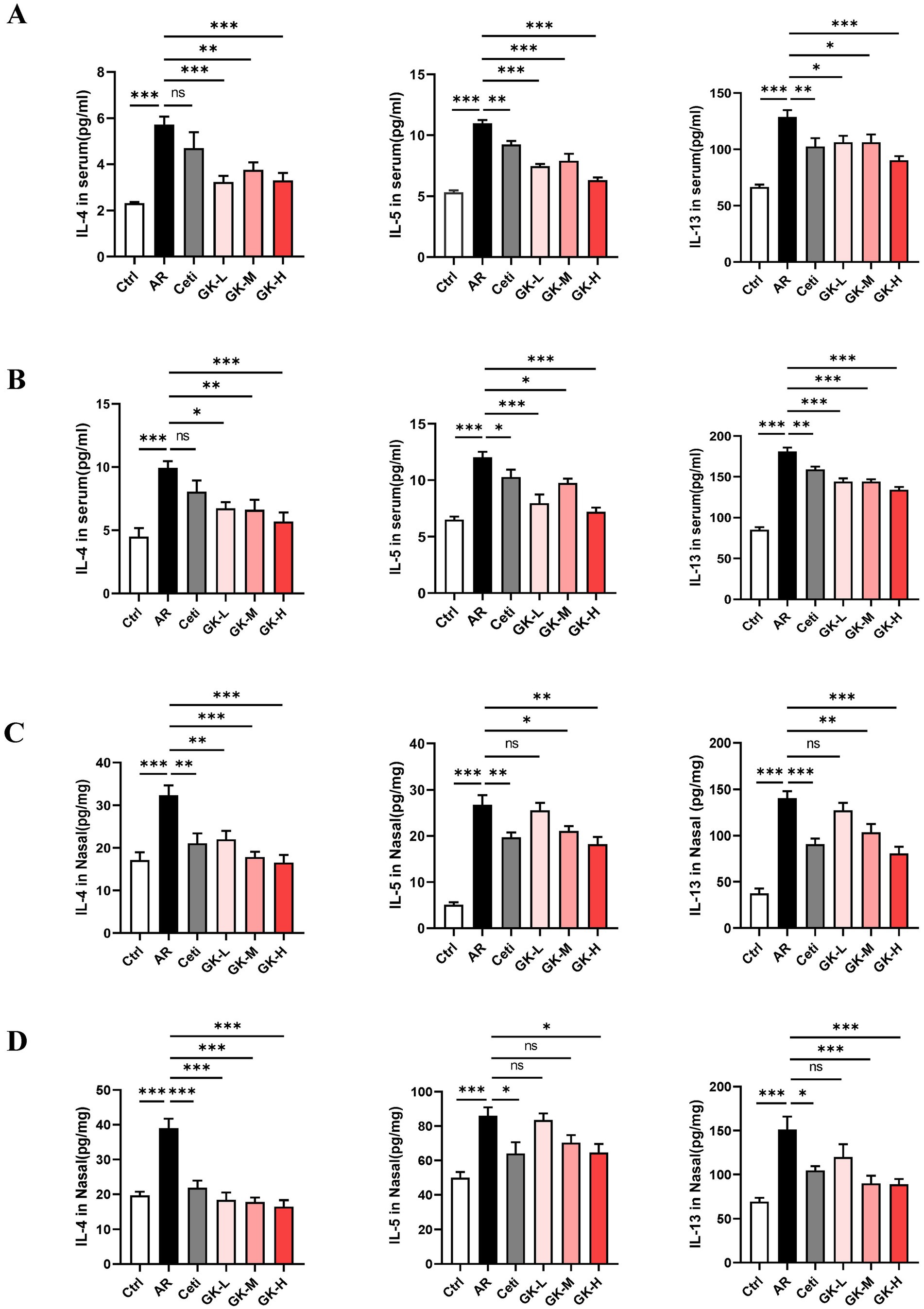 Figure 4. The effect of GUANKE strain on the levels of Th2 cytokines in the serum and nasal mucosa of AR mice induced by either RAGW or HDM. The levels of Th2 cytokines in the serum in the RAGW-induced AR model (A) and HDM-induced AR model (B) (n = 10). The levels of Th2 cytokines in the nasal mucosa in the RAGW-induced AR model (C) and HDM-induced AR model (D) (n = 5). The data are presented as the means ± SEMs. ns, not significant; *p < 0.05; **p < 0.01; ***p < 0.001. RAGW, ragweed pollen; HDM, house dust mite; Ctrl, control; AR, allergic rhinitis; Ceti, Cetirizine; GK-L, low-dose GUANKE (106 CFU); GK-M, middle-dose GUANKE (108 CFU); GK-H, high-dose GUANKE (1010 CFU).