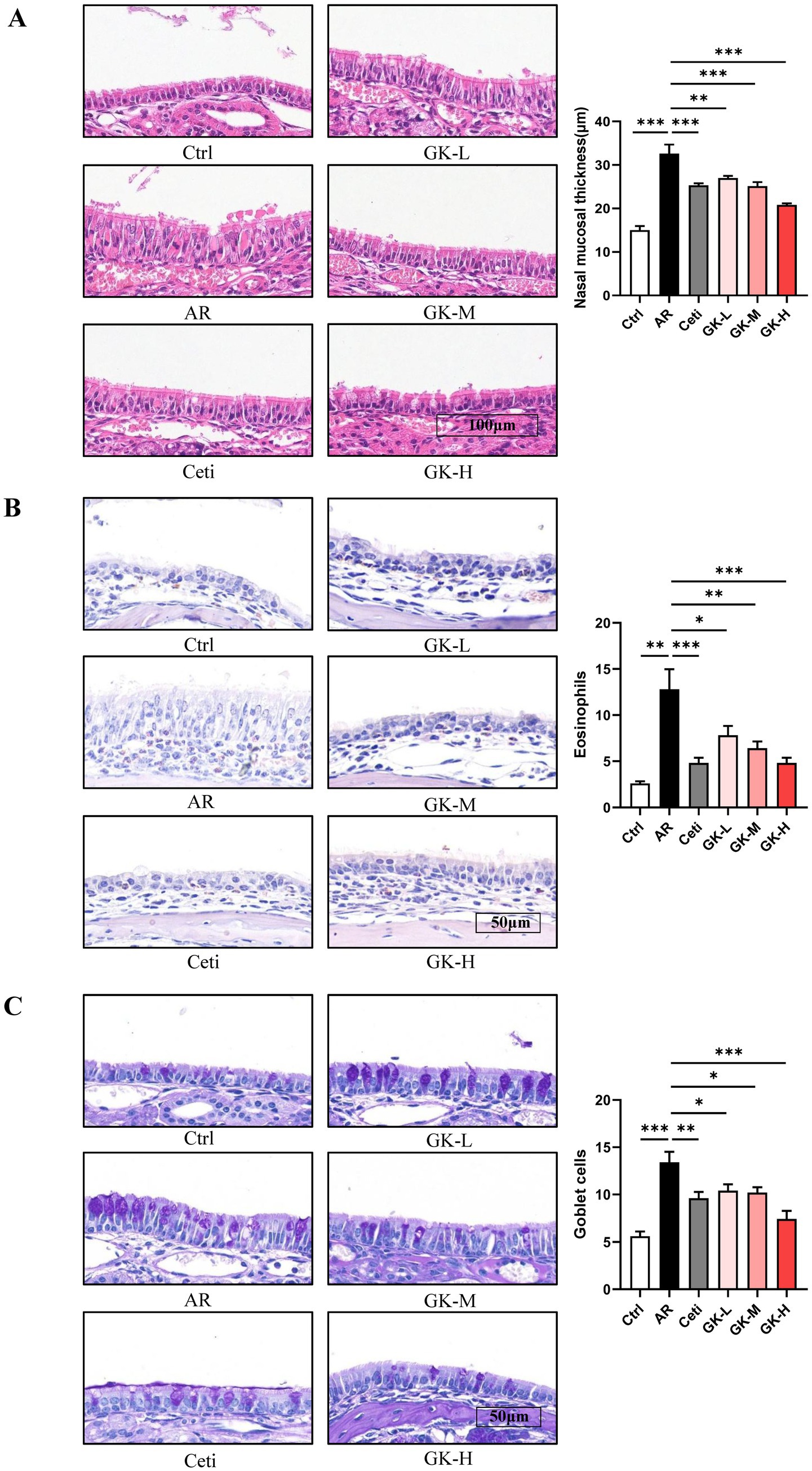 Figure 5. The effect of GUANKE strain on histopathological changes in nasal mucosa of AR mice induced by RAGW. (A) Representative H&E staining image of nasal mucosa (left) and quantification of nasal mucosal thickness (right). Magnification = 20 ×, scale bar = 100 μm; n = 5. (B) Representative chromogenic acid staining image (left) and eosinophil counts (right) of nasal mucosa. Magnification = 40 ×, scale bar = 50 μm; n = 5. (C) Representative PAS staining image (left) and goblet cell counts (right) of nasal mucosa. Magnification = 40 ×, scale bar = 50 μm; n = 5. The data are presented as the mean ± SEMs. *p < 0.05; **p < 0.01; ***p < 0.001. RAGW, ragweed pollen; Ctrl, control; AR, allergic rhinitis; Ceti, Cetirizine; GK-L, low-dose GUANKE (106 CFU); GK-M, middle-dose GUANKE (108 CFU); GK-H, high-dose GUANKE (1010 CFU).