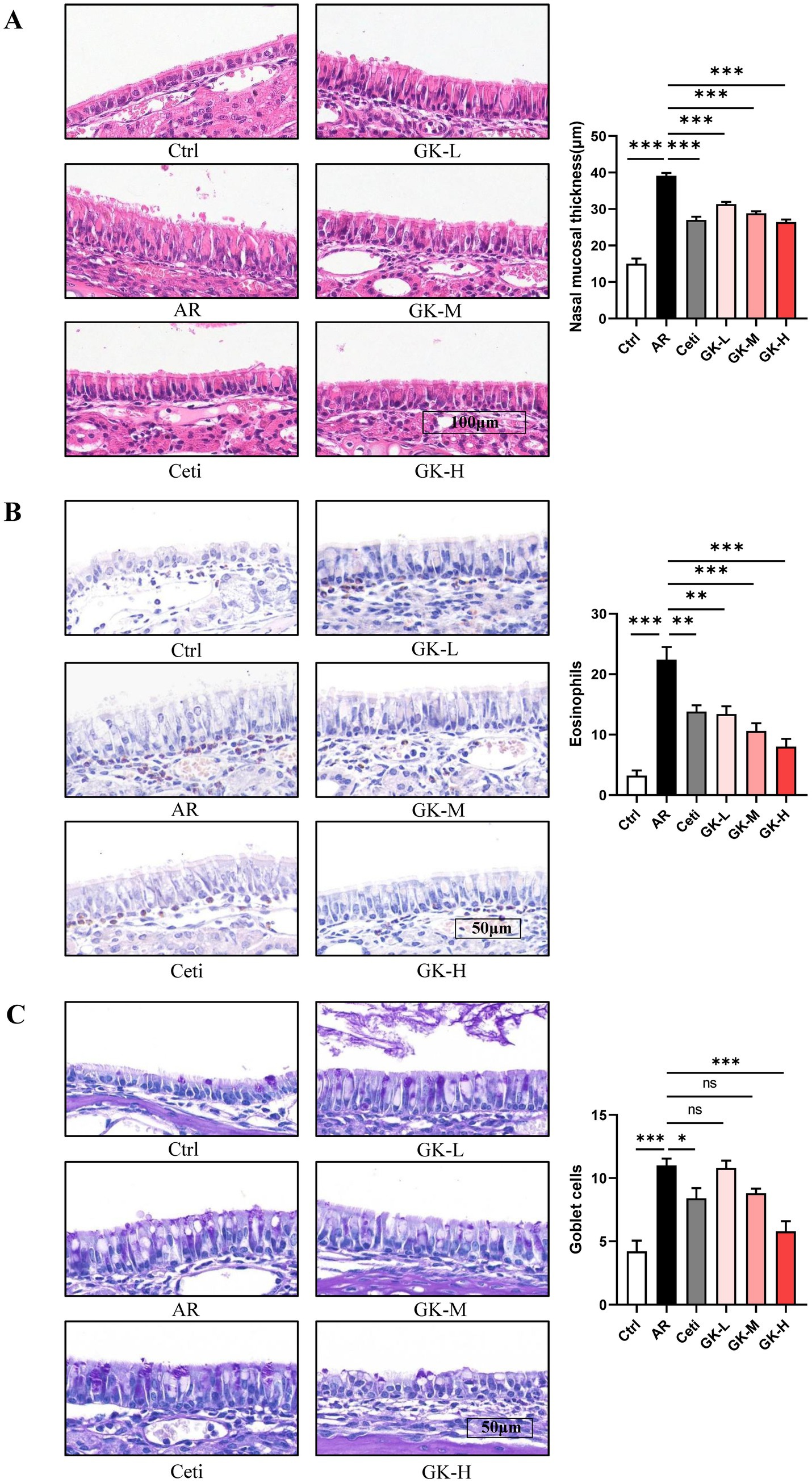 Figure 6. The effect of GUANKE strain on histopathological changes in nasal mucosa of AR mice induced by HDM. (A) Representative H&E staining image of nasal mucosa (left) and quantification of nasal mucosal thickness (right). Magnification = 20 ×, scale bar = 100 μm; n = 5. (B) Representative chromogenic acid staining image (left) and eosinophil counts (right) of nasal mucosa. Magnification = 20 ×, scale bar = 100 μm; n = 5. (C) Representative PAS staining image (left) and goblet cell counts (right) of nasal mucosa. Magnification = 20 ×, scale bar = 100 μm; n = 5. The data are presented as the mean ± SEMs. ns, not significant; *p < 0.05; **p < 0.01; ***p < 0.001. HDM, house dust mite; Ctrl, control; AR, allergic rhinitis; Ceti, Cetirizine; GK-L, low-dose GUANKE (106 CFU); GK-M, middle-dose GUANKE (108 CFU); GK-H, high-dose GUANKE (1010 CFU).