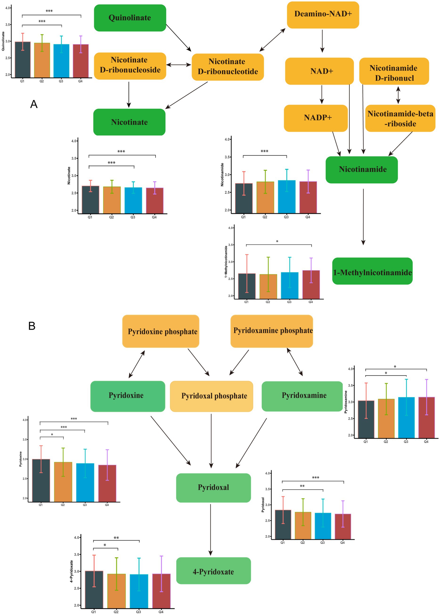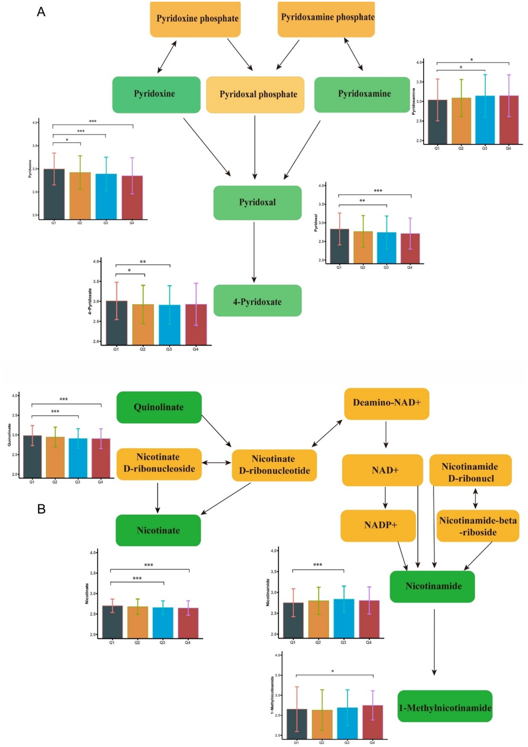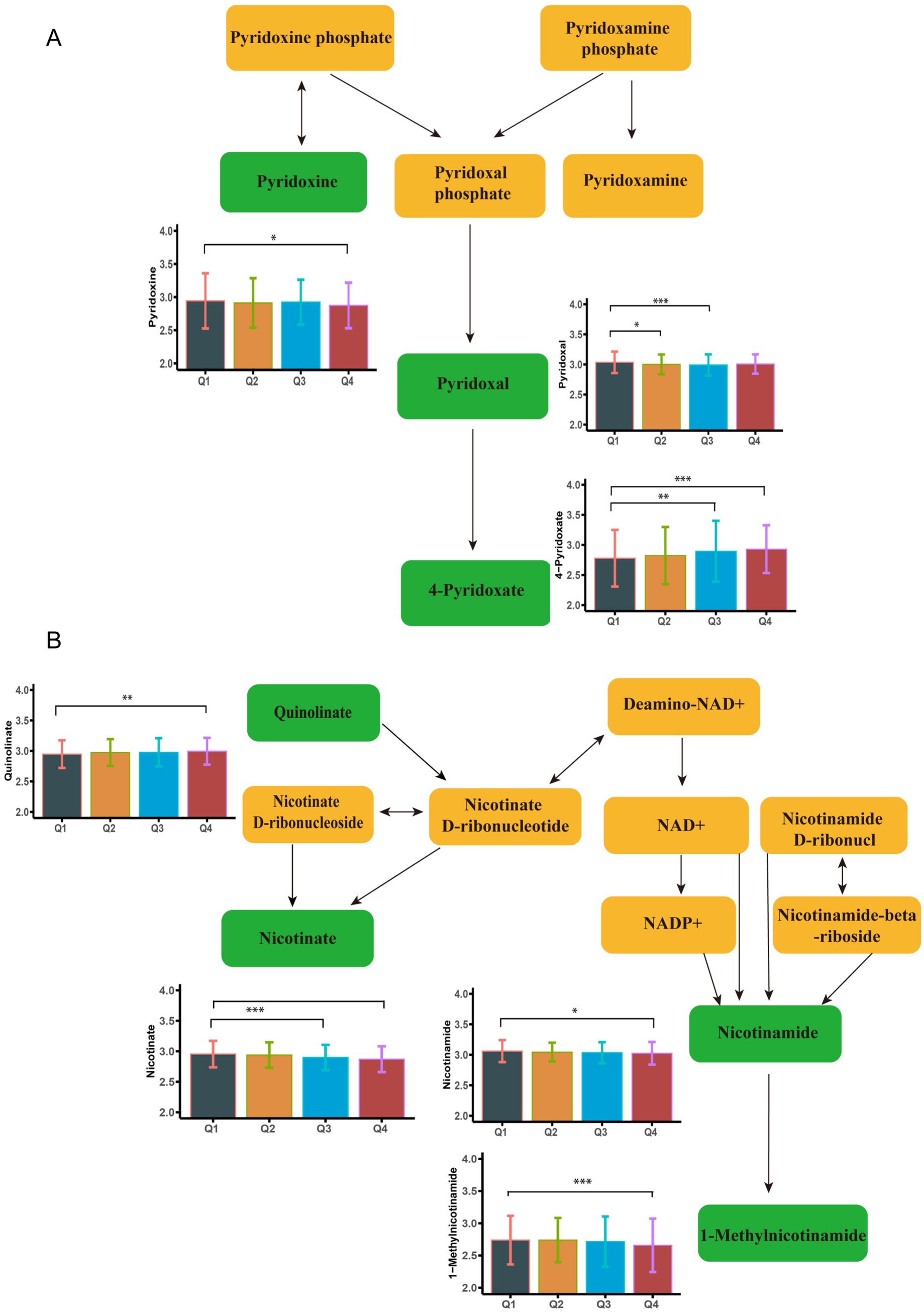 Figure 1. Metabolome changes associated with blood copper levels. (A) Vitamin B6 metabolic pathway. (B) Niacin and Niacinamide metabolic pathways. Q1: 25th percentile; Q2: 50th percentile; Q3: 75th percentile; Q4: 90th percentile; * represents p < 0.05, ** represents p < 0.01, ***represents p < 0.001, compared to the Q1 group.