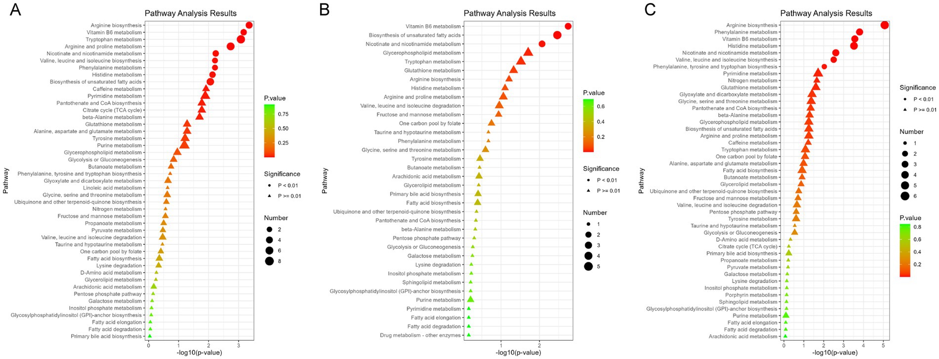 Figure 2. Enrichment analysis of metabolic pathways associated with potentially toxic elements. (A) Enrichment results of Ce metabolic pathway. (B) Enrichment results of Cu metabolic pathway. (C) Enrichment results of Fe metabolic pathway. ● indicate metabolic pathways with p < 0.01, while ▲ represent metabolic pathways with p > 0.01.