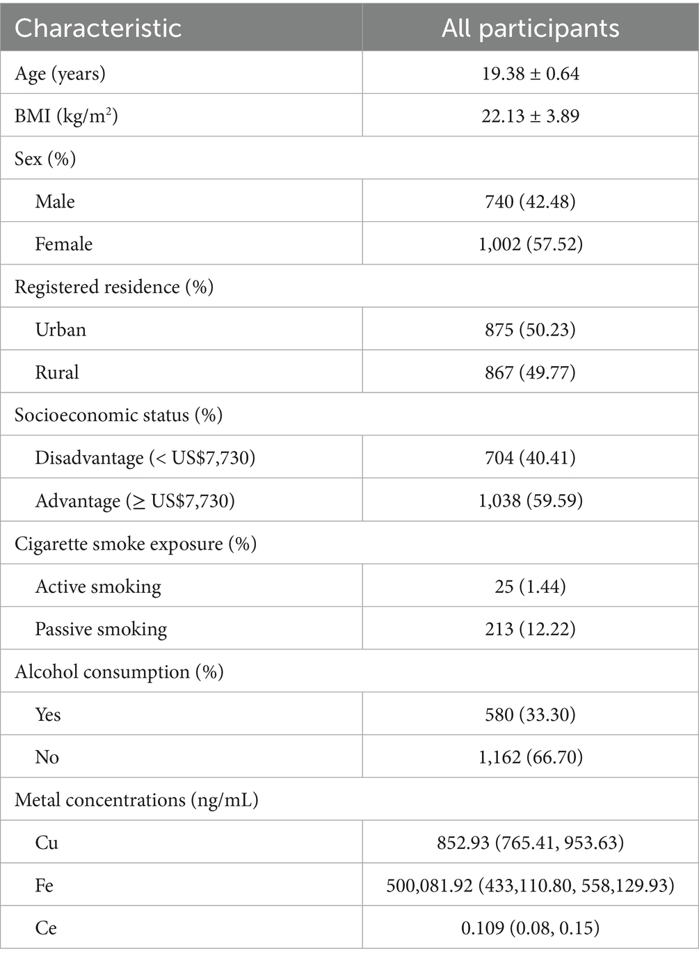 Table 1 summarizes the characteristics of the study population (n = 1,742), which included 1,002 males (57.52%) and 740 females (42.48%). The mean age of participants was 19.38 ± 0.64 years. Among them, 50.23% were urban residents. Additionally, 40.41% reported an annual household income below 50,000 RMB (≈7,730 USD). A total of 25 participants reported current smoking, and 89 reported alcohol consumption. Additionally, 213 participants had a history of smoking. The median concentrations of blood metals were as follows: copper (Cu), 852.93 (765.41, 953.63) ng/mL; cerium (Ce), 0.11 (0.08, 0.15) ng/mL; and iron (Fe), 500,081.92 (433,110.80, 558,129.93) ng/mL. Descriptive statistics for blood metal levels in different gender groups were presented in Supplementary Table S1.