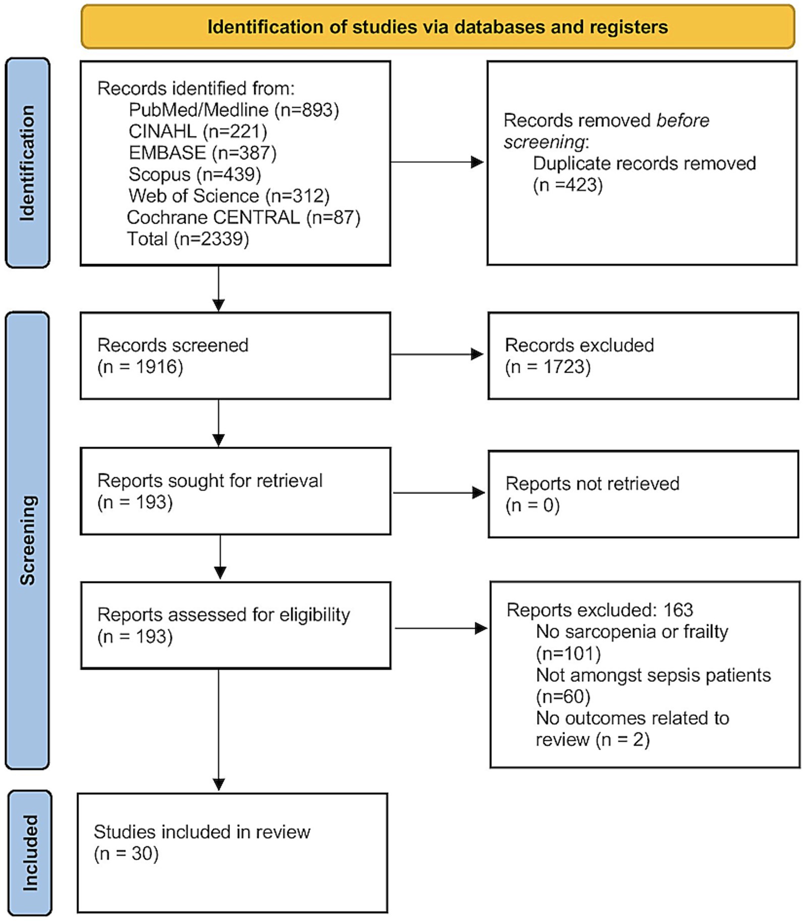 Figure 1 summarizes the study selection process. A total of 2,339 records were identified through database searches, of which 423 duplicates were removed before screening. After title and abstract review of 1,916 unique records, 1,723 were excluded. Full texts of 193 articles were assessed for eligibility, leading to the exclusion of 163 reports. Of them, 101 did not assess sarcopenia or frailty, 60 were not conducted in sepsis populations, and 2 lacked relevant outcomes. Ultimately, 30 studies met all criteria and were included (18, 27–54).