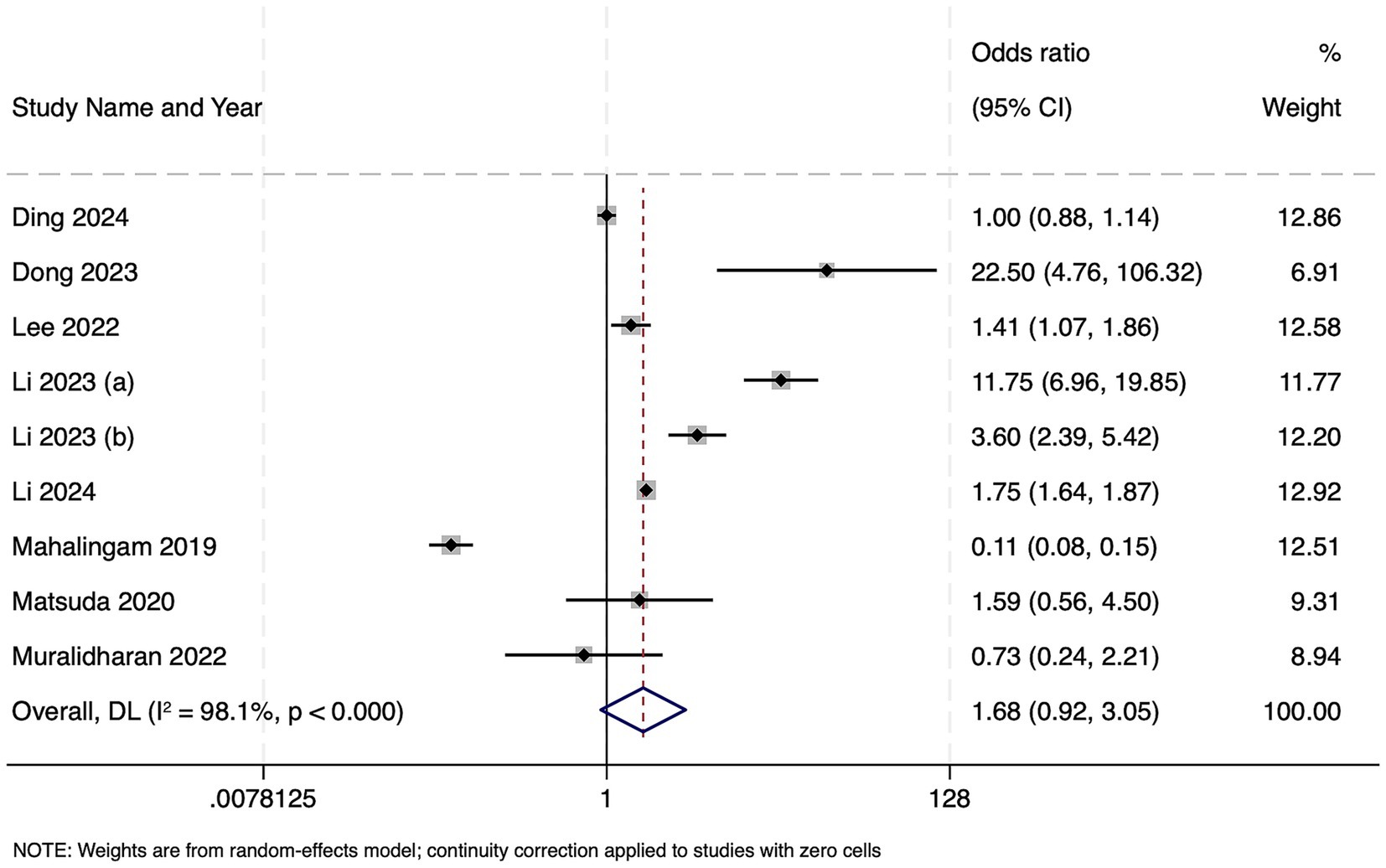 Frailty was reported in nine studies with 33,978 participants. The results showed that frailty was associated with a non-significant trend toward higher mortality in sepsis (OR 1.68, 95% CI 0.92–3.05; z = 1.69, p = 0.091) (Figure 3). There was very high between-study heterogeneity (Cochran’s Q = 419.59, df = 8, p < 0.001; I2 = 98.1%), and the estimated between-study variance (τ2) was 0.7202. Publication bias assessment was not possible due to limited number of studies and hence, the results should be interpreted with caution.