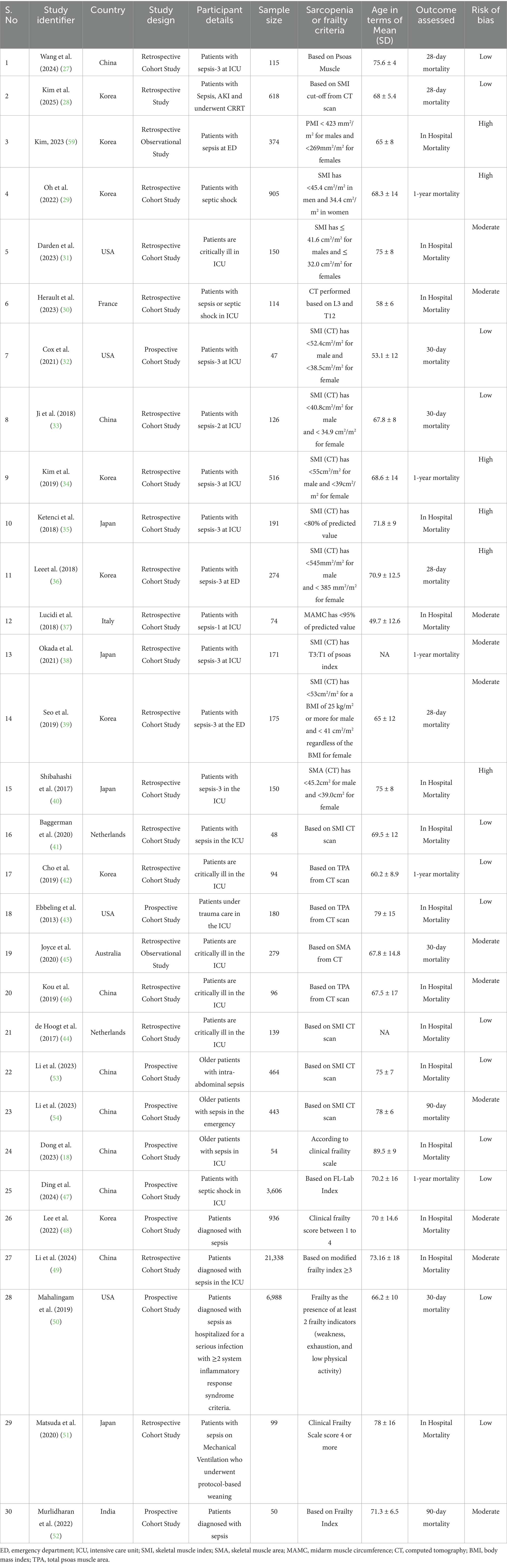 Table 1 summarizes the characteristics of the 30 studies assessing sarcopenia or frailty in patients with sepsis or septic shock and their association with various mortality endpoints. These investigations were conducted across nine countries: China (n = 8), Korea (n = 8), USA (n = 4), Japan (n = 4), Netherlands (n = 2), and one study each from France, Italy, Australia, and India. Twenty-one studies used a retrospective cohort or observational design, while nine were prospective cohort studies. Sample sizes varied widely, from as few as 47 participants to as many as 21,338, and mean patient ages spanned from 49.7 ± 12.6 years to 89.5 ± 9 years.