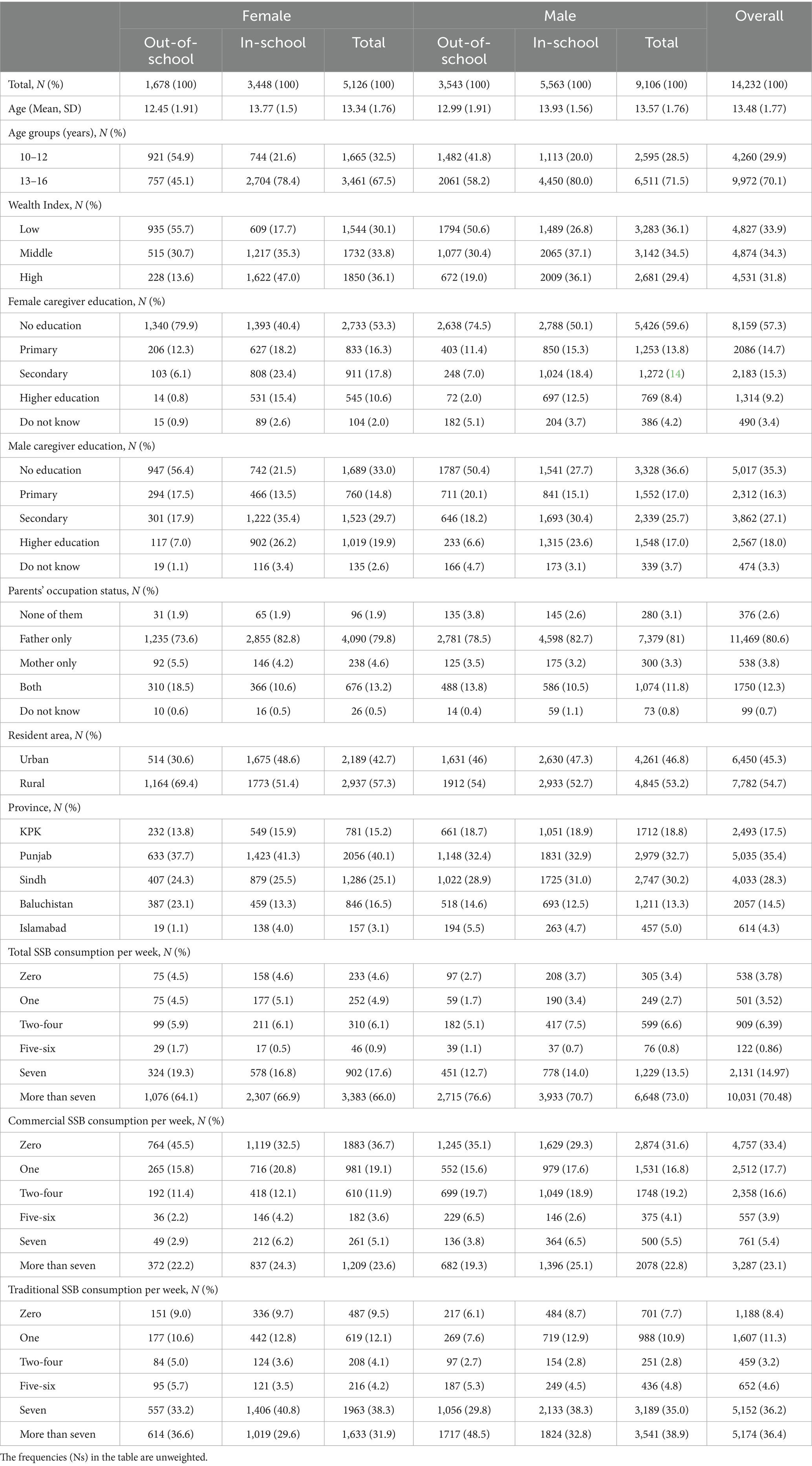 This study addresses these evidence gaps by providing nationally representative estimates of total, commercial (packaged), and traditional (home-prepared) SSB consumption among both in-school and out-of-school adolescents in Pakistan. By providing a more granular and context-specific understanding of adolescent SSB intake, this research aims to inform targeted, culturally relevant policies to reduce SSB consumption and its contribution to the rising burden of non-communicable diseases in Pakistan. This is a timely contribution, as the policy interest in SSB-related policy activities is increasing in the country, as exemplified by bans on sugary drinks in school canteens in Sindh and pending legislation in Punjab (23, 24).