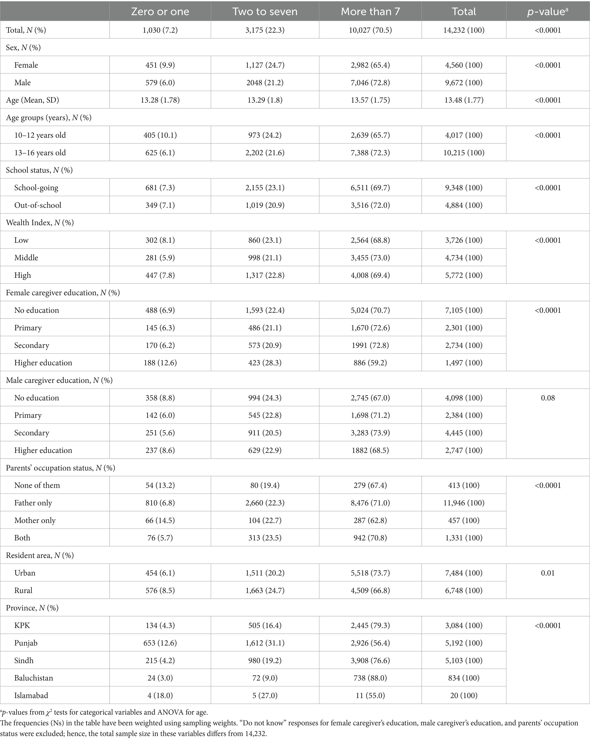 Table 1. Characteristics of the study sample (total and by sex and school status) among adolescents in Pakistan, 2023 & 2024, N = 14,232.