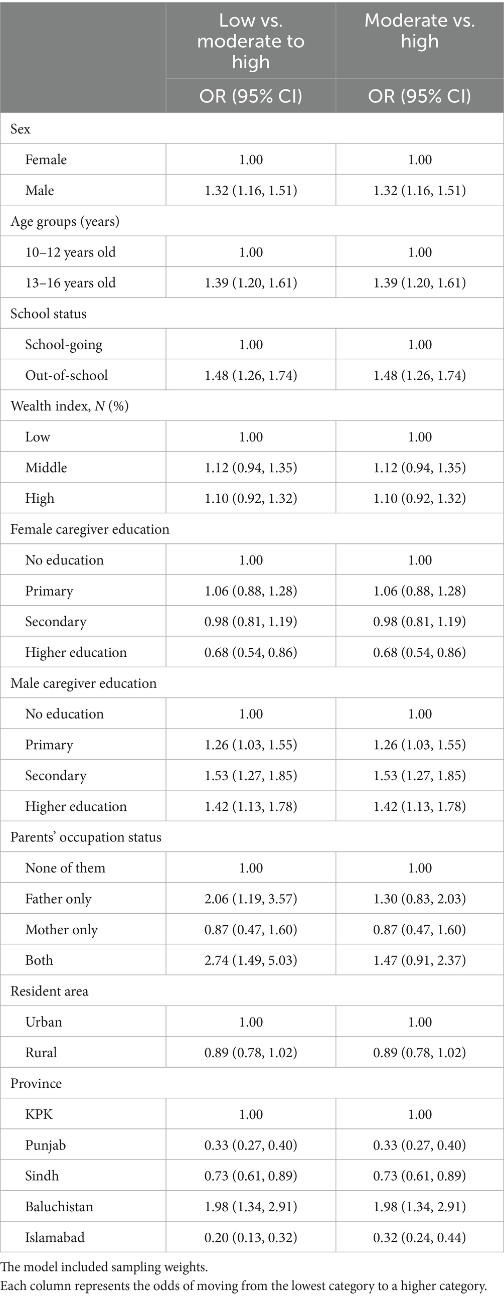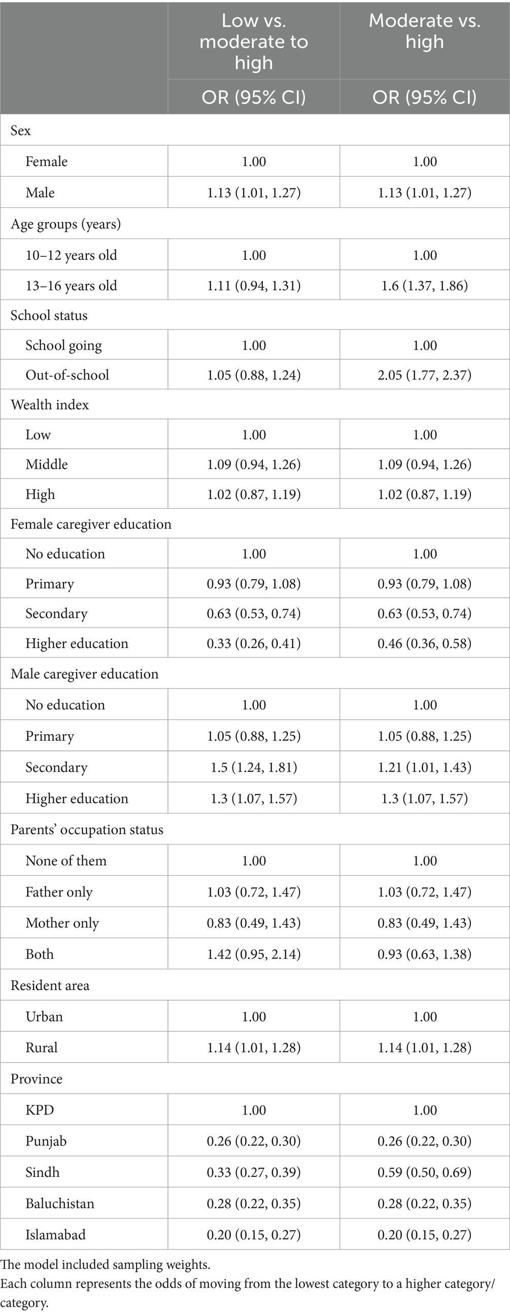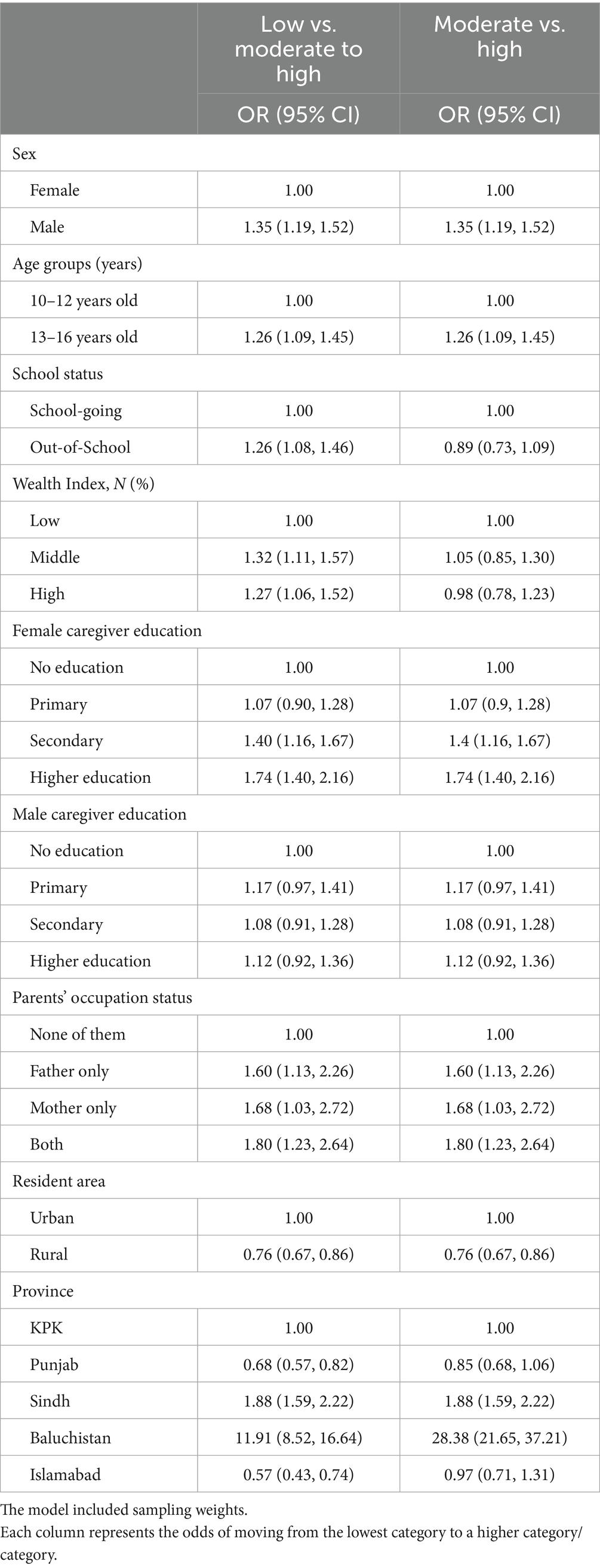 Patterns were largely consistent for high versus moderate intake. Males, older adolescents, and out-of-school adolescents had significantly greater odds of high intake, while female caregiver higher education remained protective. Regional differences followed the same pattern, with Balochistan showing higher odds and Punjab and Islamabad lower odds compared with Khyber Pakhtunkhwa. Details are provided in Table 3.