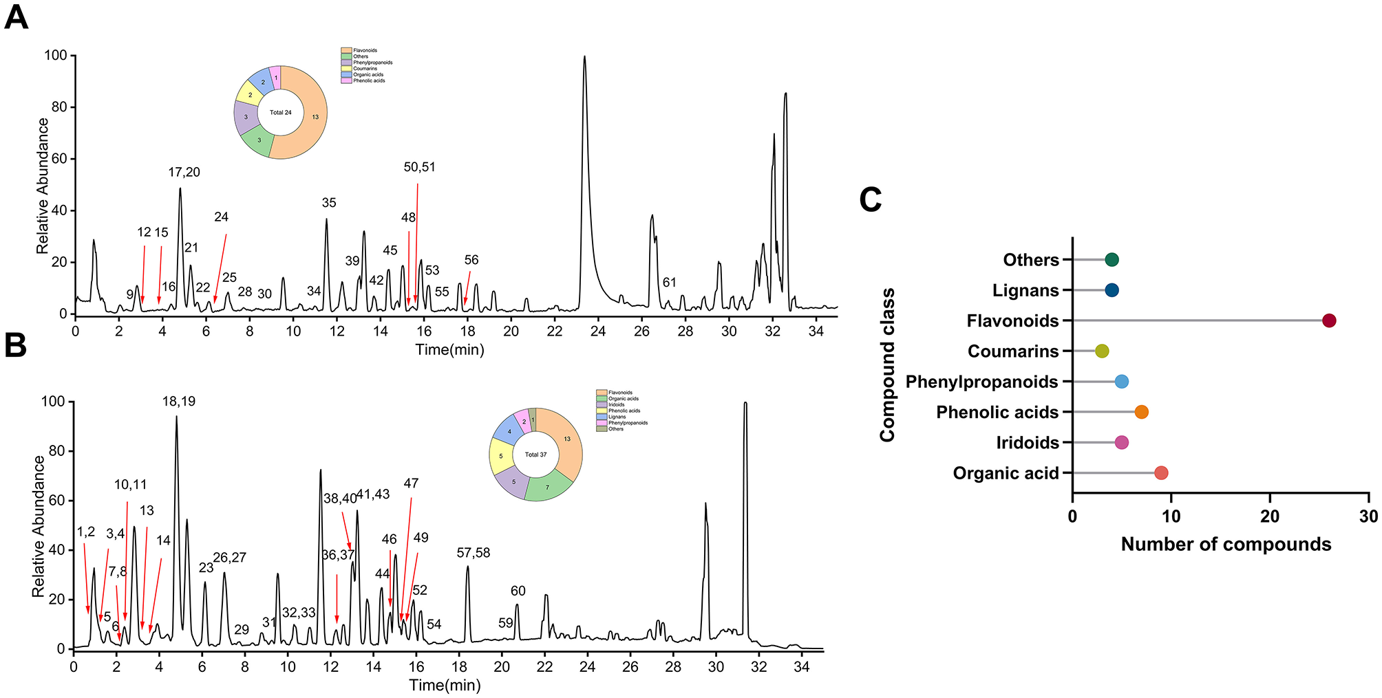 These metabolites were categorized into eight principal classes. Flavonoids constituted the predominant group (N = 26), detected in both ionization modes. The majority of organic acids (N = 9), phenolic acids (N = 6), iridoids (N = 5), and lignans (N = 4) were primarily observed in the negative ion mode. Conversely, all two coumarins were exclusively detected in the positive ion mode, which also facilitated the identification of five phenylpropanoids and four additional compounds.